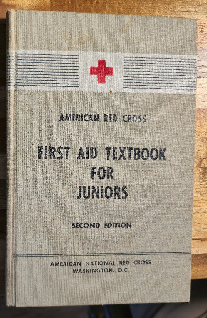 The product is a 1953 American Red Cross First Aid Textbook specifically designed for juniors. This second edition textbook was published by the Red Cross organization in the United States. It is a valuable collectible item for those interested in historical memorabilia related to fraternal organizations like the Red Cross. The textbook provides important information on first aid techniques and practices from the mid-20th century, making it a unique and informative piece for collectors and history enthusiasts.