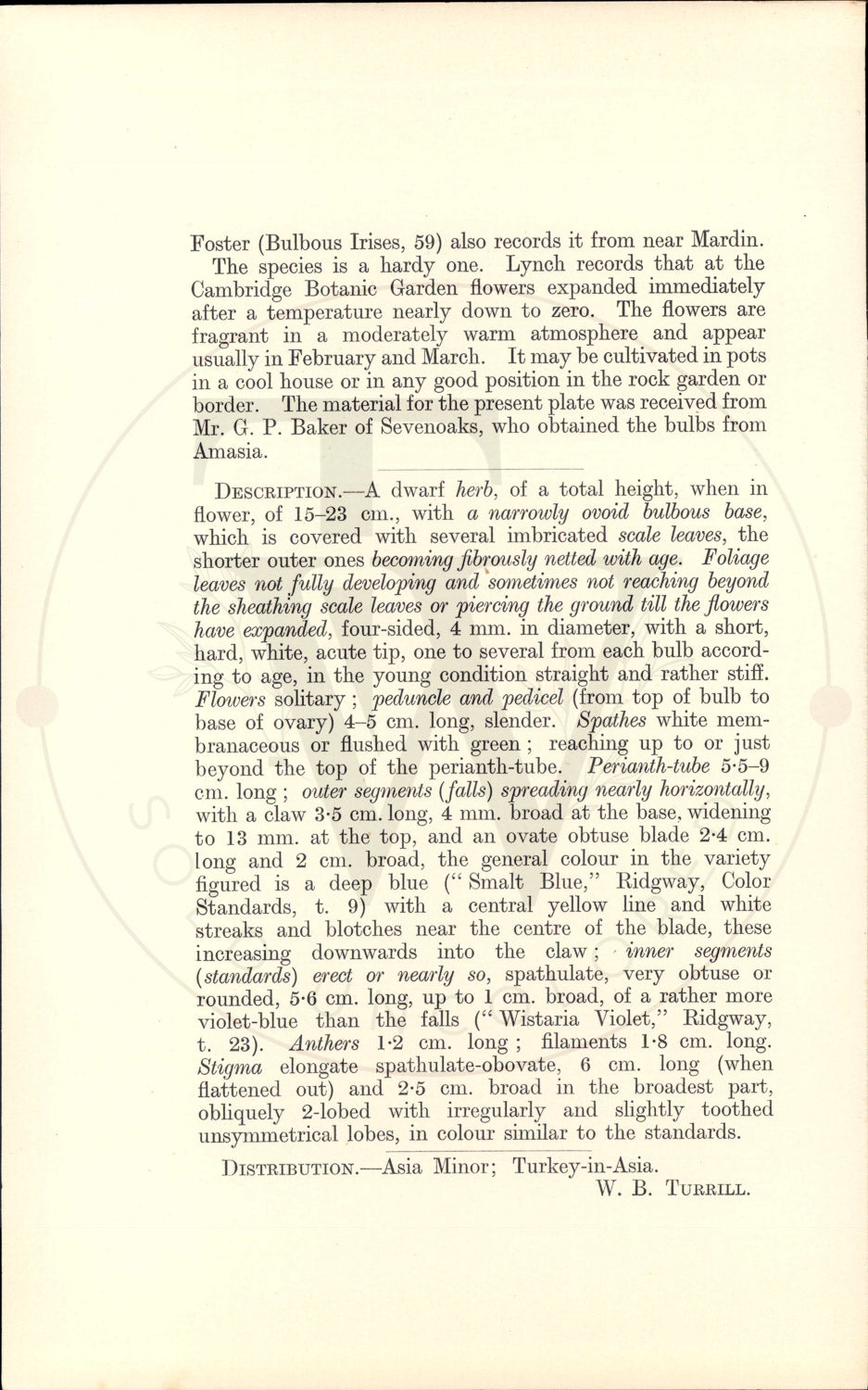 The beautiful dwarf bulbous iris, which is the subject of our plate, was considered to be a variety of I. reticulata for some time after its introduction into cultivation. Dykes (1.c. 1913, 1914) has given valid reasons for retaining it as a distinct species. The early appearance of the flowers relative to the leaves and the erect standards are particularly important characters. The type was sent to Sir Michael Foster by Miss Wright of the American Mission, from the neighbourhood of Amasia. A specimen in the Kew Herbarium collected by Bornm?ller (Pl. exs. Anatoliae orientalis), "Amasia: in regionibus alpinis et subalpinis, 16.3.1889," is the only wild material of the species available. It appears without doubt to represent the plant figured here. I. histrioides var. sophensis (Foster) Dykes was distinguished by its narrow perianth segments and stigmata and by the flower colour with a peculiar metallic sheen" varying "from a dark red-purple to a blue- purple, or to a lilac or lavender." It came from near Kharput, which is in the district whose ancient name was Sophene.