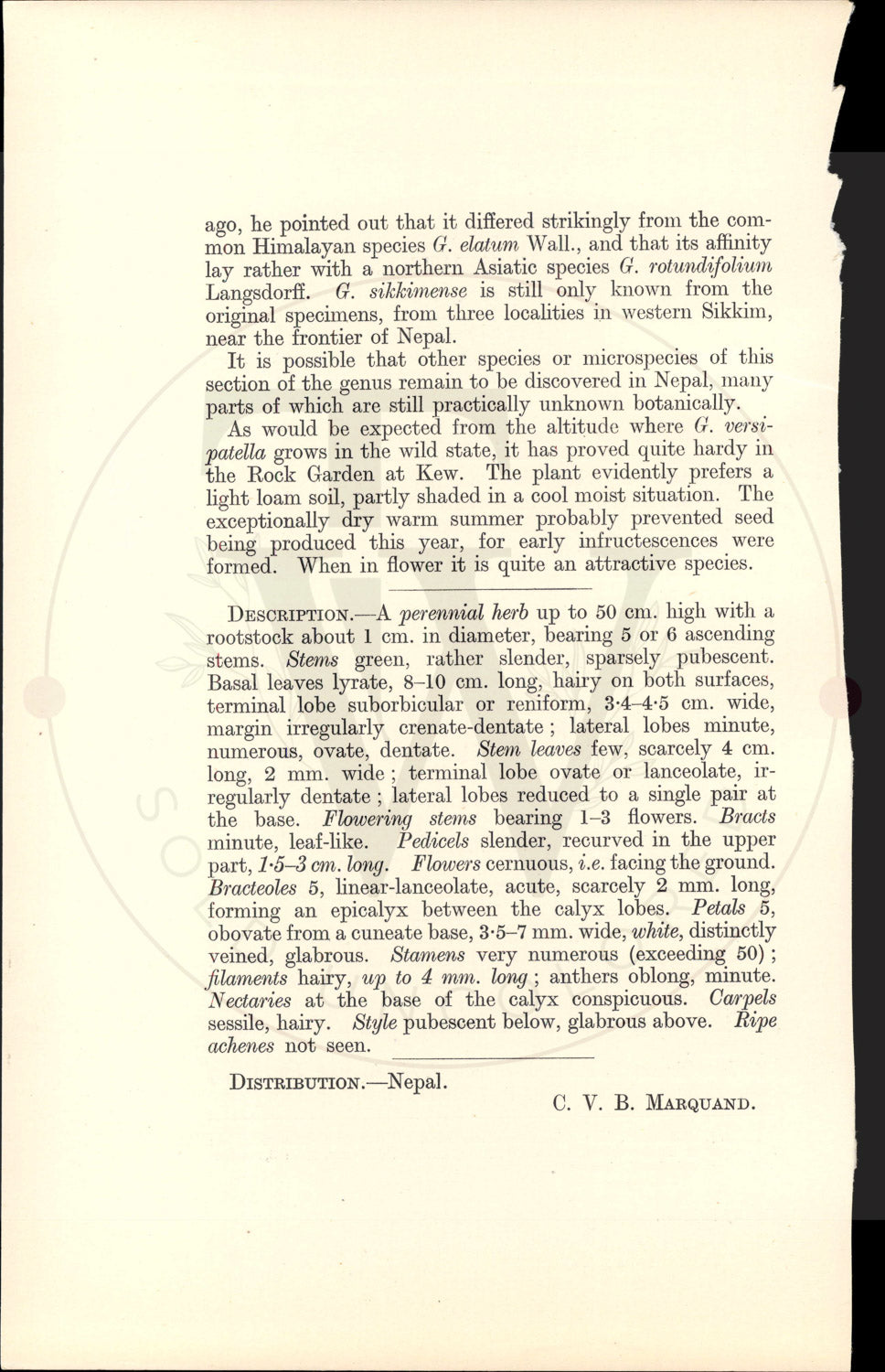 The plant from which the accompanying plate was drawn on June 2nd, 1930, was raised at Kew from seed obtained by Capt. Lall Dhwoj in Nepal and received through Mr. T. Hay in 1929. One plant which flowered in the Royal Botanic Gardens, Kew, in 1930, is alive at the time of writing, but it has never produced ripe achenes. The specific name was suggested by the late Dr. O. Stapf in reference to the flower, which, owing to the recurving of the upper part of the pedicel, faces downwards (as is also the case in e.g. Lilium Martagon), in which position it resembles an inverted plate. Unfortunately, however, Dr. Stapf did not prepare any notes or descriptions. No precise localities accompanied this batch of 63 packets of Nepalese seed, but it seems probable that the plant came from an altitude of 4500 metres in that country for two speci- mens of this species, collected by Capt. Lall Dhwoj, are in the British Museum Herbarium. They are labelled respec- tively "Michet 15,000 ft. (recd. 1929), Lall Dhwoj 78" and Tangba 14-15,000 ft. 1930, Lall Dhwoj 216." These localities are west and east of Katmandu in 28 degrees 30' N., 85 degrees E. and 27 degrees 30' N., 86 degrees 30' E. respectively. Nothing further is known about this interesting plant. It differs from its most closely allied species in the flowers being white instead of yellow, in the much longer pedicels and in having rather more numerous stamens with longer.