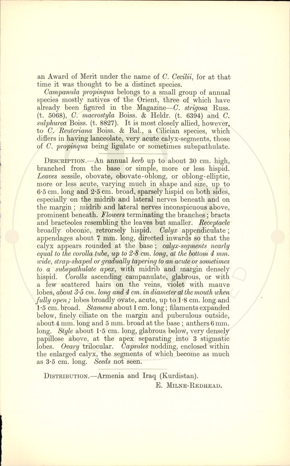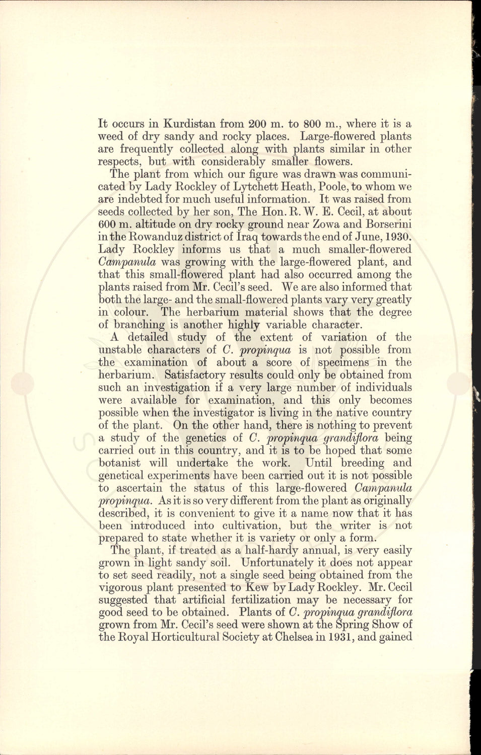 On first sight this striking plant appears to be distinct from any species of Campanula hitherto described. Further investigation, however, has shown that size alone separates it from Campanula propinqua Fisch. & Mey., a species which was described in 1835 from plants cultivated in the St. Petersburg Botanic Garden from seeds collected in the Persian province of Azerbaijan. Plants from the same source as the type specimen of C. propinqua are preserved in the herbarium at Kew, together with a large number of more recent gatherings of the species. It is possible to arrange the available material in a graduated series according to the size of the corolla, and so perfect is the gradation that it is impossible to draw a line in any one place that would separate the series into two natural groups. Our plant comes at the top of this series, its extreme size probably being due to favourable conditions of cultivation, although one or two of the specimens from wild localities are only very slightly.