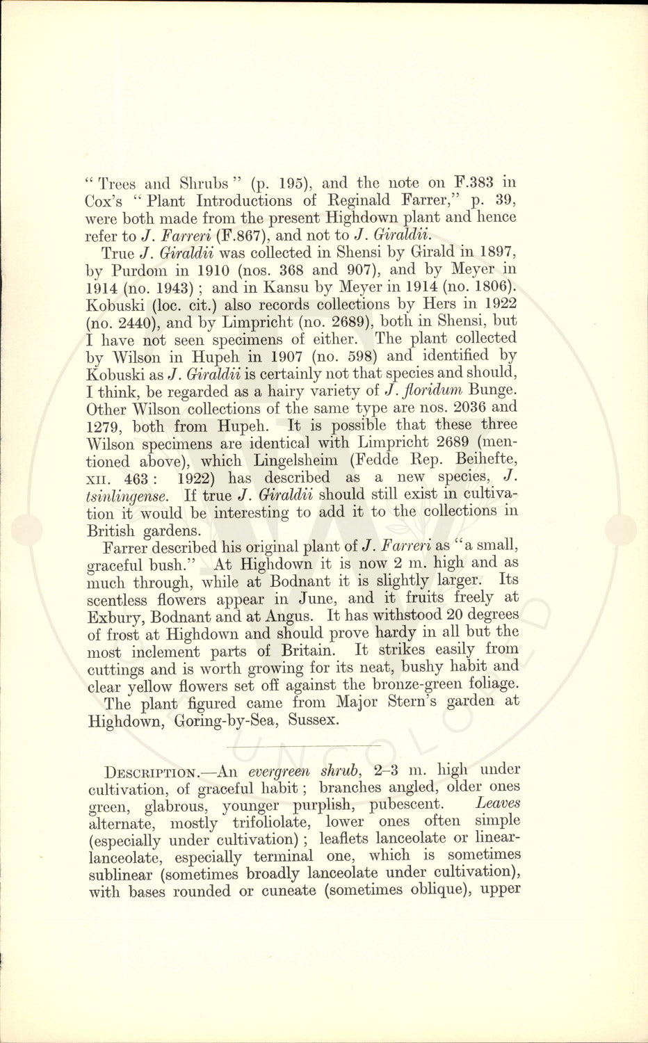 This alternate-leaved Jasmine was collected by Farrer on April 25th, 1919, at 2286 m., on an open arid outcrop of limestone ridge just below the D?k Bungalow," Hpimaw Hill, Upper Burma (F.867), and, so far as can be ascertained, has never been collected since in that or any other locality. Seeds and dried specimens were sent to the Royal Botanic Garden, Edinburgh, where the plant was tentatively named very near J. Giraldii Diels." This name subsequently became more definitely attached to the plant and it is so labelled in gardens where it is now growing. On comparing, however, Farrer's original dried material with authentic specimens of J. Giraldii collected by Girald in Shensi and with material of allied species, it is evident that the present plant represents an undescribed species, to which the name Jasminum Farreri has here been assigned. It is, indeed, hardly surprising that plants from such widely different botanical regions as N. China and Upper Burma should prove to be distinct species. J. Farreri is allied to a number of species of the series Alternifolia, especially to J. Giraldii Diels, J. humile L. (in the.