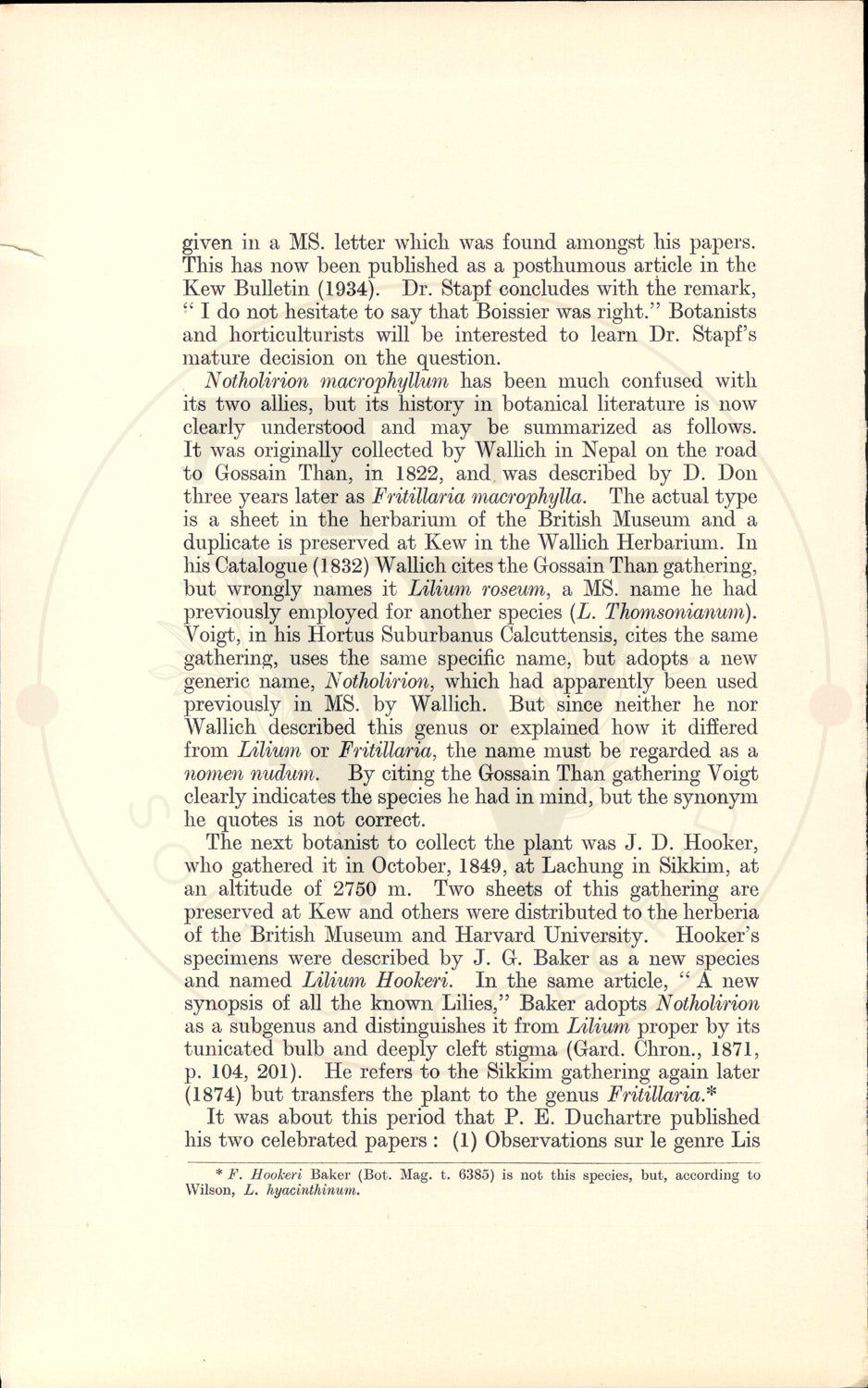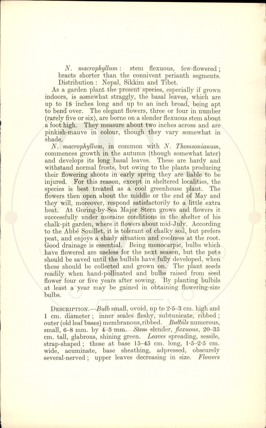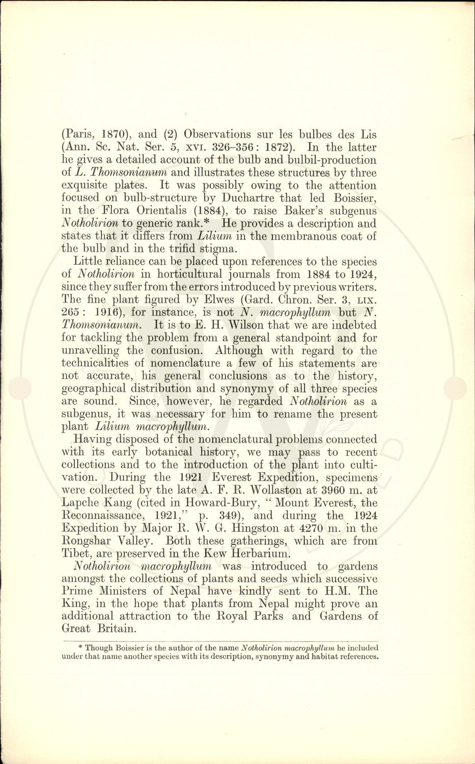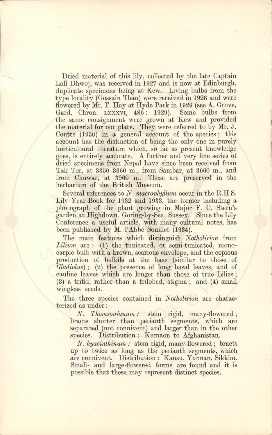 The three plants known as Lilium macrophyllum, L. Thomsonianum and L. hyacinthinum form a closely allied trio, obviously standing somewhat apart from typical species of the genus Lilium. Each of the three species has been referred at one time or another to the genus Fritillaria, but it has been generally felt that they were even more anomalous amongst fritillaries than they were amongst the lilies. The Swiss botanist Boissier placed L. macrophyllum in a separate genus, Notholirion, employing an old name which had not previously been clearly defined with generic rank, and for some years the advisability or otherwise of adopting Boissier's genus for this species and its two immediate allies has been occupying the minds of botanists. Dr. O. Stapf, just prior to his death, investigated this question and his views are.