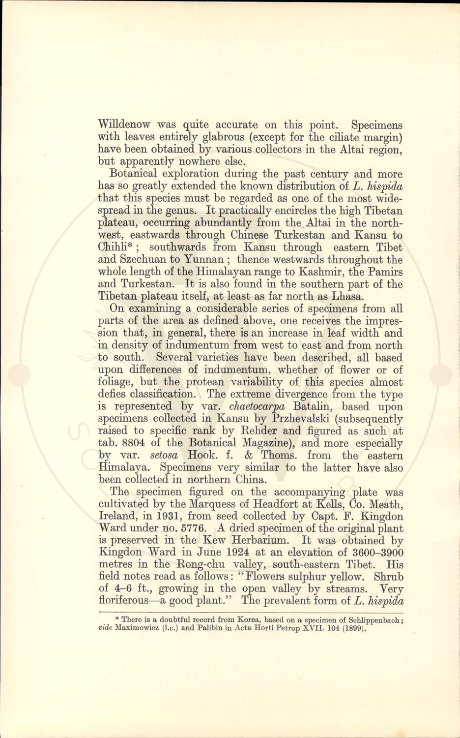 The name Lonicera hispida was originally given by Pallas to a plant he collected in the Altai Mountains of Siberia. A short description of this plant, drawn up by Willdenow, was published from his MSS. by Roemer and Schultes in their 16th edition of Linn?'s Systema Vegetabilium (1819). The more important characters were as follows: branches hispid with rigid hairs from minute scattered tubercles; leaves ovate, nearly 2? ins. long, 1 in. wide, glabrous on both surfaces, ciliate, petiolate; axillary buds as long as the petiole; bracts ovate-elliptic, as long as the berry. Of this description it must be remarked that the characters italicized are only rarely met with; indeed, no specimen has been seen in which the bracts do not exceed the berry (even when ripe), and in the absence of confirmation from the type specimen it may perhaps be doubted whether *Vide Sprague in Kew Bull. 1933, p. 383, 387.