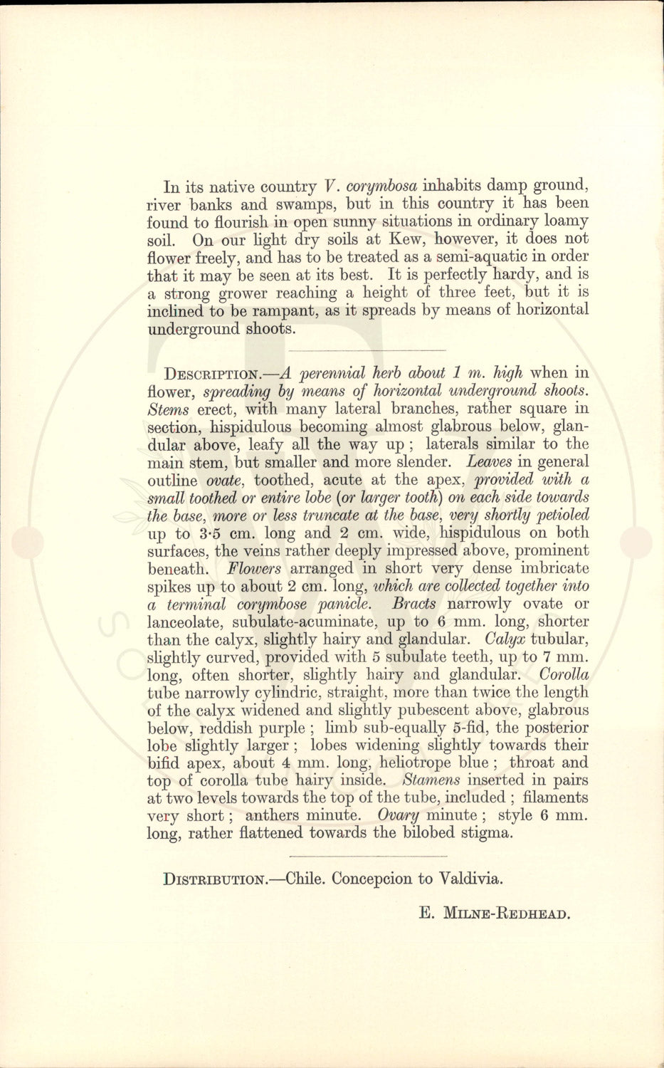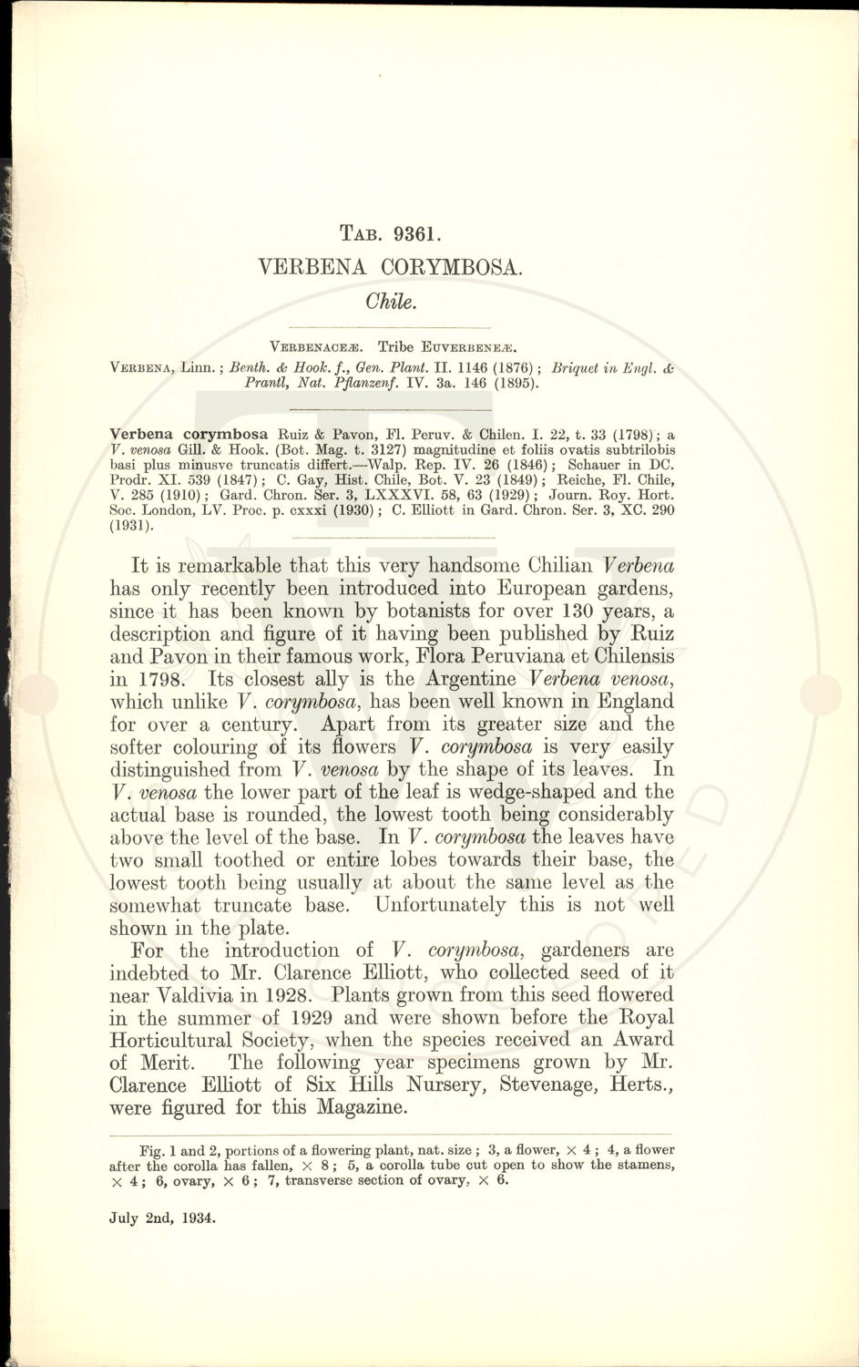 It is remarkable that this very handsome Chilian Verbena has only recently been introduced into European gardens, since it has been known by botanists for over 130 years, a description and figure of it having been published by Ruiz and Pavon in their famous work, Flora Peruviana et Chilensis in 1798. Its closest ally is the Argentine Verbena venosa, which unlike V. corymbosa, has been well known in England for over a century. Apart from its greater size and the softer colouring of its flowers V. corymbosa is very easily distinguished from V. venosa by the shape of its leaves. In V. venosa the lower part of the leaf is wedge-shaped and the actual base is rounded, the lowest tooth being considerably above the level of the base. In V. corymbosa the leaves have two small toothed or entire lobes towards their base, the lowest tooth being usually at about the same level as the somewhat truncate base. Unfortunately this is not well shown in the plate. For the introduction of V. corymbosa, gardeners are indebted to Mr. Clarence Elliott, who collected seed of it near Valdivia in 1928. Plants grown from this seed flowered in the summer of 1929 and were shown before the Royal Horticultural Society, when the species received an Award of Merit. The following year specimens grown by Mr. Clarence Elliott of Six Hills Nursery, Stevenage, Herts., were figured for this Magazine.