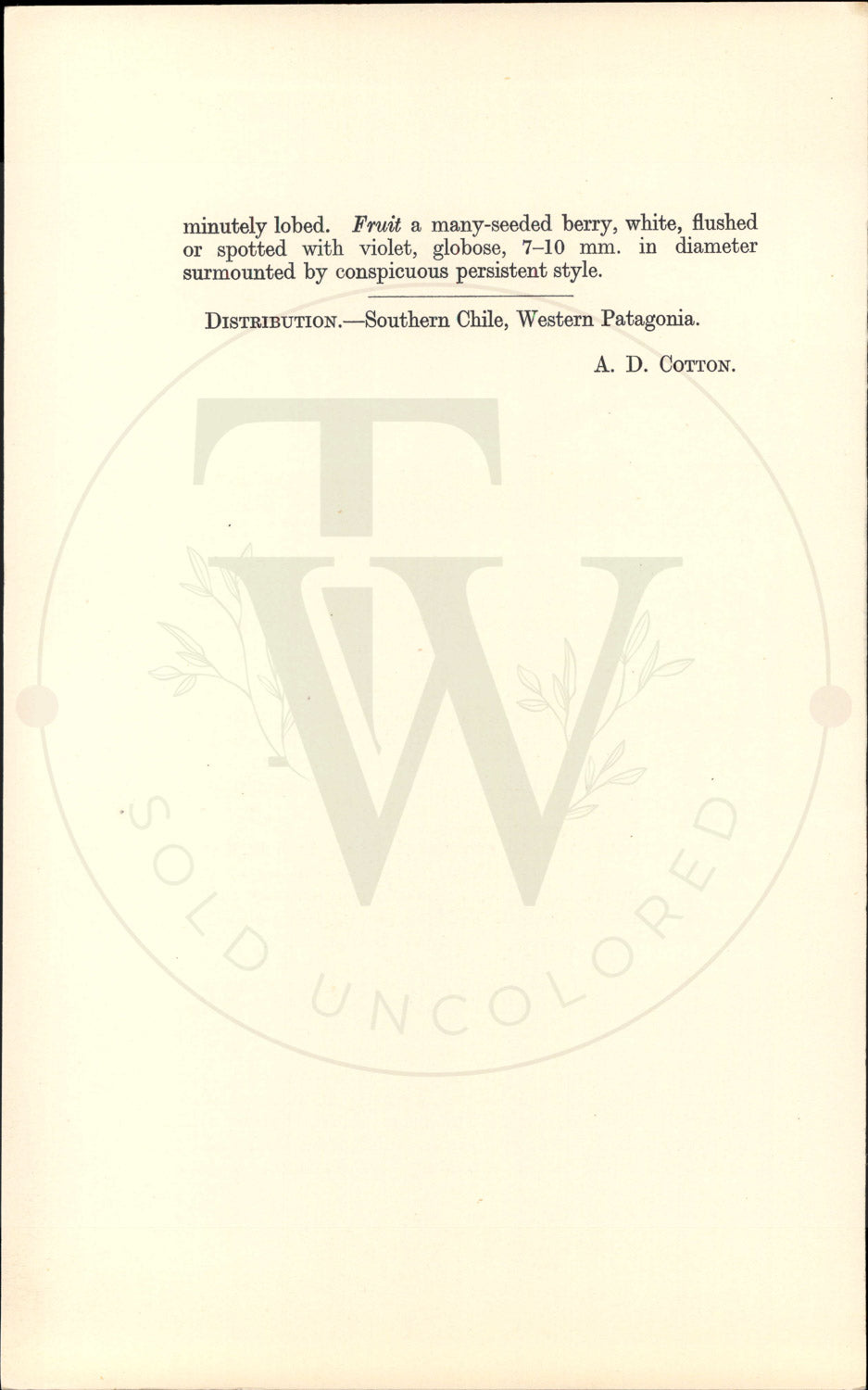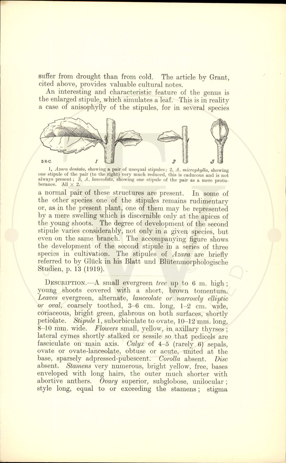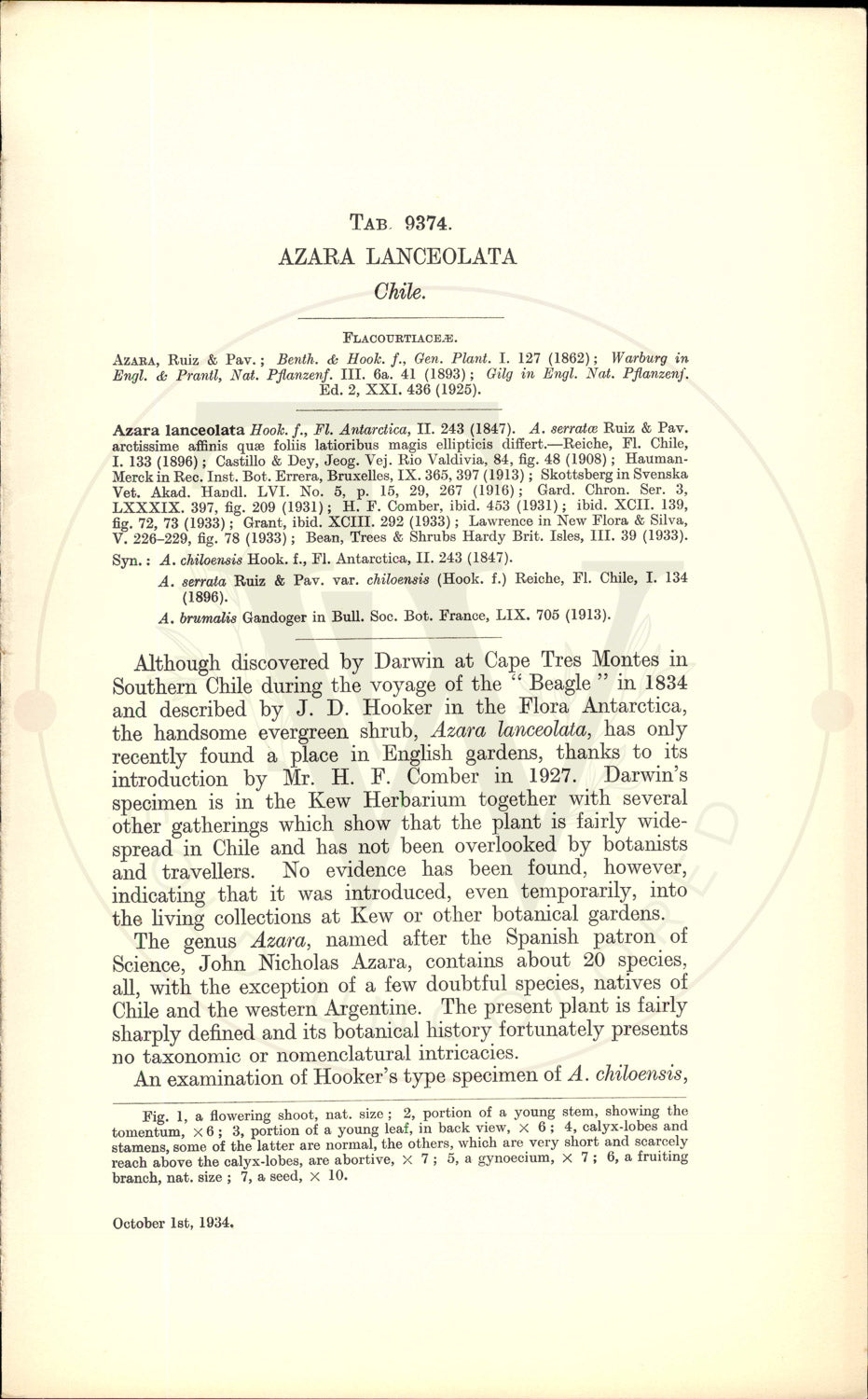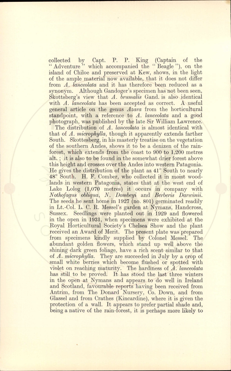 Syn. A. chiloensis Hook. f., Fl. Antarctica, II. 243 (1847). A. serrata Ruiz & Pav. var. chiloensis (Hook. f.) Reiche, Fl. Chile, I. 134 (1896). A. brumalis Gandoger in Bull. Soc. Bot. France, LIX. 705 (1913). Although discovered by Darwin at Cape Tres Montes in Southern Chile during the voyage of the "Beagle" in 1834 and described by J. D. Hooker in the Flora Antarctica, the handsome evergreen shrub, Azara lanceolata, has only recently found a place in English gardens, thanks to its introduction by Mr. H. F. Comber in 1927. Darwin's specimen is in the Kew Herbarium together with several