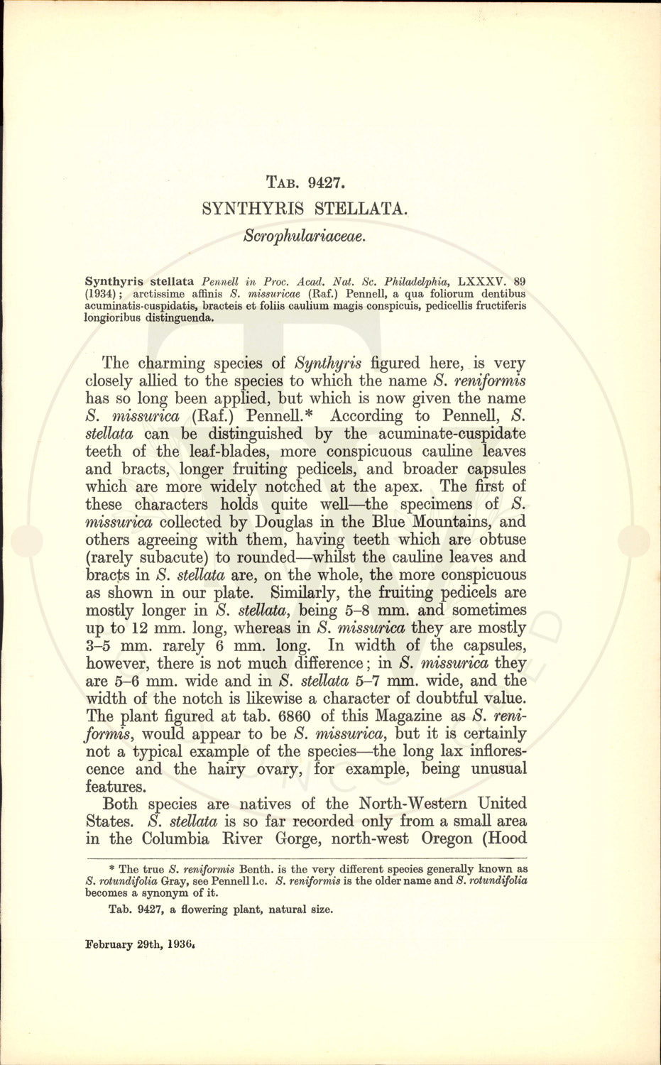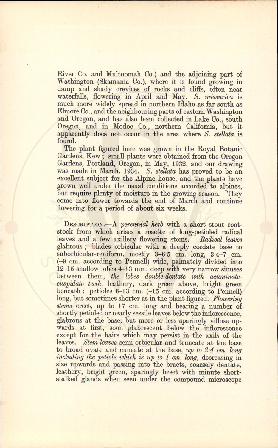 The plant figured at tab. 6860 of this Magazine as S. reni- formis, would appear to be S. missurica, but it is certainly not a typical example of the species-the long lax inflores- cence and the hairy ovary, for example, being unusual features. Both species are natives of the North-Western United States. S. stellata is so far recorded only from a small area in the Columbia River Gorge, north-west Oregon (Hood * The true S. reniformis Benth. is the very different species generally known as S. rotundifolia Gray, see Pennell 1.c. S. reniformis is the older name and S. rotundifolia becomes a synonym of it.