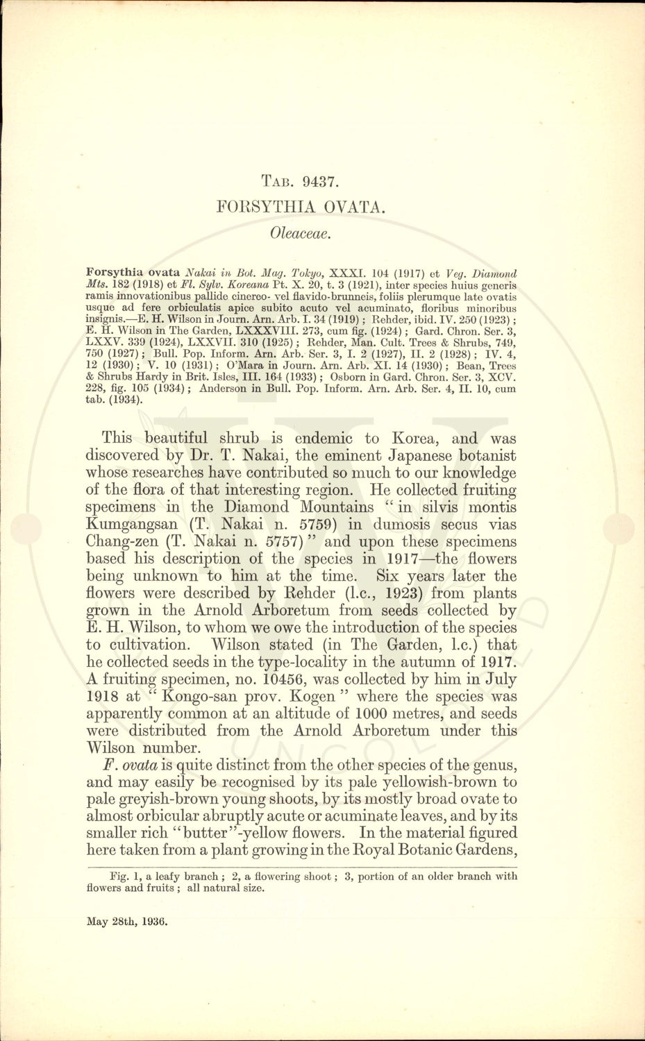 This beautiful shrub is endemic to Korea, and was discovered by Dr. T. Nakai, the eminent Japanese botanist whose researches have contributed so much to our knowledge of the flora of that interesting region. He collected fruiting specimens in the Diamond Mountains "in silvis montis Kumgangsan (T. Nakai n. 5759) in dumosis secus vias Chang-zen (T. Nakai n. 5757)" and upon these specimens based his description of the species in 1917-the flowers being unknown to him at the time. Six years later the flowers were described by Rehder (l.c., 1923) from plants grown in the Arnold Arboretum from seeds collected by E. H. Wilson, to whom we owe the introduction of the species to cultivation. Wilson stated (in The Garden, 1.c.) that he collected seeds in the type-locality in the autumn of 1917. A fruiting specimen, no. 10456, was collected by him in July 1918 at Kongo-san prov. Kogen" where the species was apparently common at an altitude of 1000 metres, and seeds were distributed from the Arnold Arboretum under this Wilson number. F. ovata is quite distinct from the other species of the genus, and may easily be recognised by its pale yellowish-brown to pale greyish-brown young shoots, by its mostly broad ovate to almost orbicular abruptly acute or acuminate leaves, and by its smaller rich "butter"-yellow flowers. In the material figured here taken from a plant growing in the Royal Botanic Gardens,.