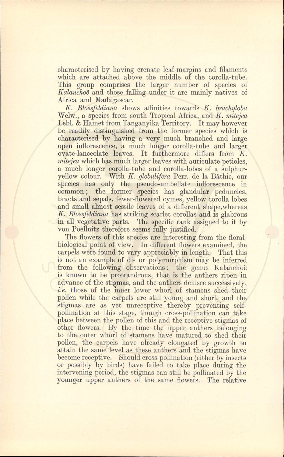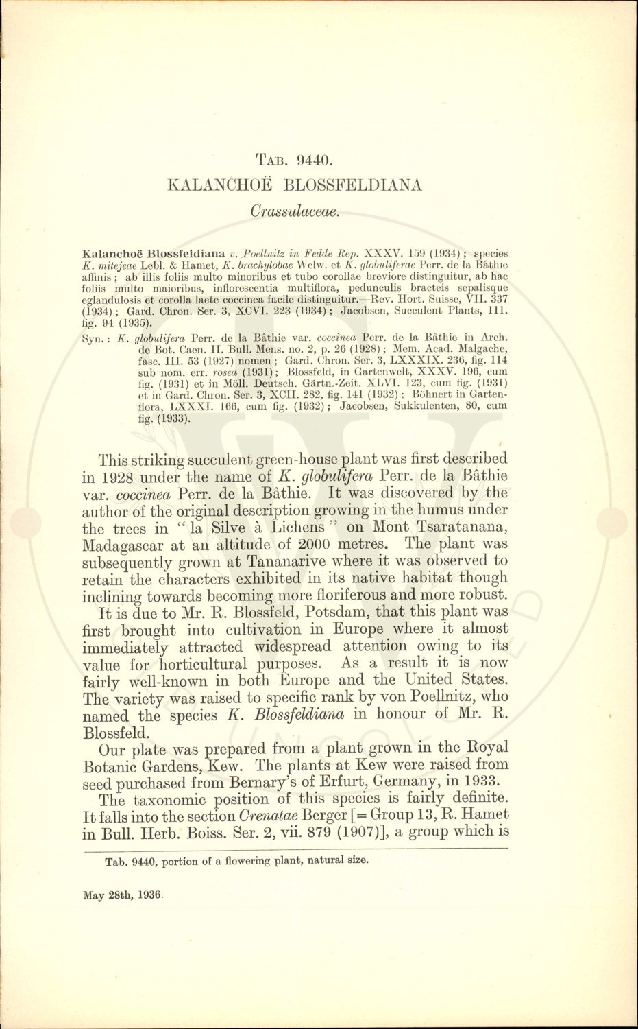(1934); Gard. Chron. Ser. 3, XCVI. 223 (1934); Jacobsen, Succulent Plants, 111. fig. 94 (1935). Syn. K. globulifera Perr. de la B thie var. coccinea Perr. de la B thie in Arch. de Bot. Caen. II. Bull. Mens. no. 2, p. 26 (1928); Mem. Acad. Malgache, fasc. III. 53 (1927) nomen; Gard. Chron. Ser. 3, LXXXIX. 236, fig. 114 sub nom. err. rosea (1931); Blossfeld, in Gartenwelt, XXXV. 196, cum fig. (1931) et in M ll. Deutsch. G rtn.-Zeit. XLVI. 123, cum fig. (1931) et in Gard. Chron. Ser. 3, XCII. 282, fig. 141 (1932); B hnert in Garten- flora, LXXXI. 166, cum fig. (1932); Jacobsen, Sukkulenten, 80, cum fig. (1933). This striking succulent green-house plant was first described in 1928 under the name of K. globulifera Perr. de la B thie var. coccinea Perr. de la B thie. It was discovered by the author of the original description growing in the humus under the trees in "la Silve Lichens" on Mont Tsaratanana, Madagascar at an altitude of 2000 metres. The plant was subsequently grown at Tananarive where it was observed to retain the characters exhibited in its native habitat though inclining towards becoming more floriferous and more robust. It is due to Mr. R. Blossfeld, Potsdam, that this plant was first brought into cultivation in Europe where it almost immediately attracted widespread attention owing to its value for horticultural purposes. As a result it is now fairly well-known in both Europe and the United States. The variety was raised to specific rank by von Poellnitz, who named the species K. Blossfeldiana in honour of Mr. R. Blossfeld. Our plate was prepared from a plant grown in the Royal Botanic Gardens, Kew. The plants at Kew were raised from seed purchased from Bernary's of Erfurt, Germany, in 1933. The taxonomic position of this species is fairly definite. It falls into the section Crenatae Berger [= Group 13, R. Hamet in Bull. Herb. Boiss. Ser. 2, vii. 879 (1907)], a group which is.