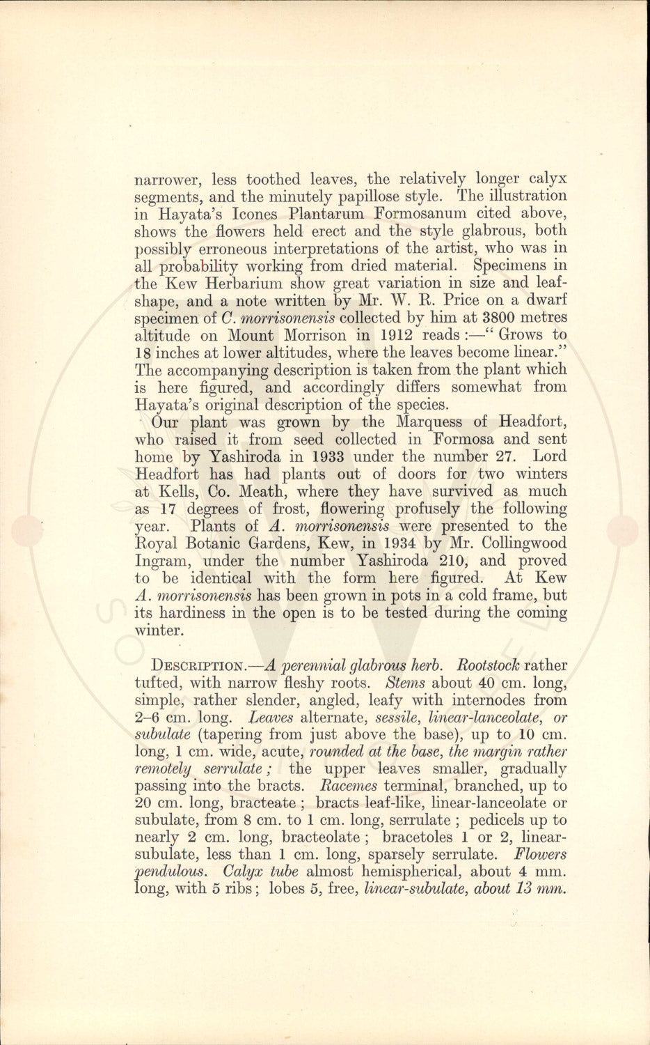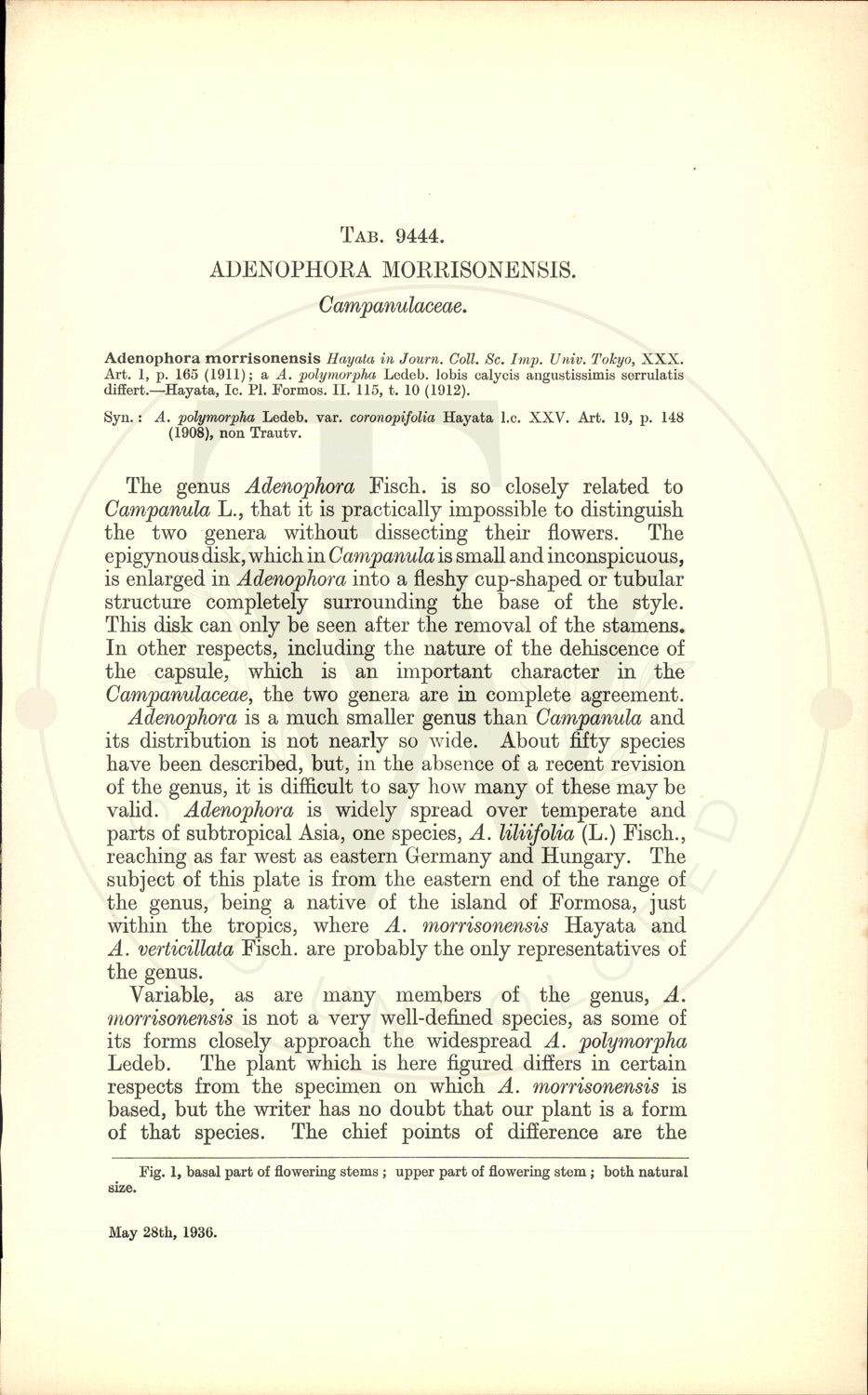 Have been described, but, in the absence of a recent revision of the genus, it is difficult to say how many of these may be valid. Adenophora is widely spread over temperate and parts of subtropical Asia, one species, A. liliifolia (L.) Fisch., reaching as far west as eastern Germany and Hungary. The subject of this plate is from the eastern end of the range of the genus, being a native of the island of Formosa, just within the tropics, where A. morrisonensis Hayata and A. verticillata Fisch. are probably the only representatives of the genus. Variable, as are many members of the genus, A. morrisonensis is not a very well-defined species, as some of its forms closely approach the widespread A. polymorpha Ledeb. The plant which is here figured differs in certain respects from the specimen on which A. morrisonensis is based, but the writer has no doubt that our plant is a form of that species. The chief points of difference are the.