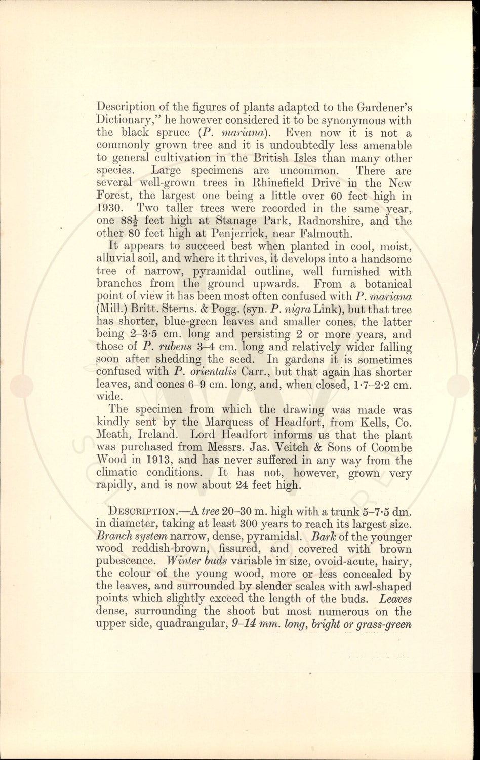 Description of the figures of plants adapted to the Gardener's Dictionary," he however considered it to be synonymous with the black spruce (P. mariana). Even now it is not a commonly grown tree and it is undoubtedly less amenable to general cultivation in the British Isles than many other species. Large specimens are uncommon. There are several well-grown trees in Rhinefield Drive in the New Forest, the largest one being a little over 60 feet high in.