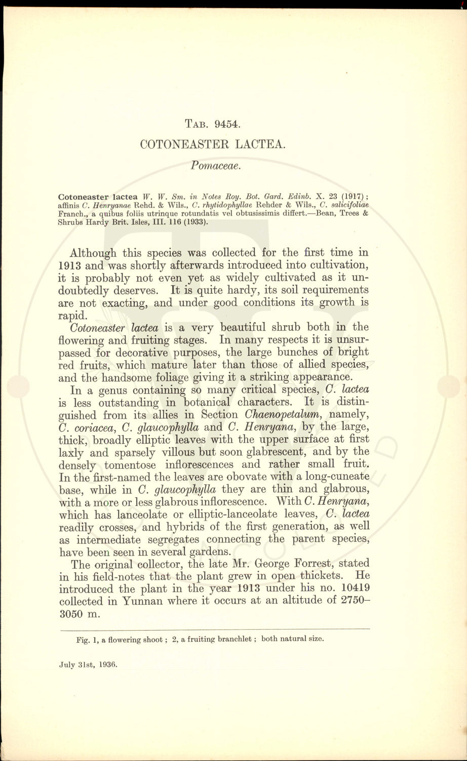Cotoneaster lactea is a very beautiful shrub both in the flowering and fruiting stages. In many respects it is unsur- passed for decorative purposes, the large bunches of bright red fruits, which mature later than those of allied species, and the handsome foliage giving it a striking appearance. In a genus containing so many critical species, C. lactea is less outstanding in botanical characters. It is distin- guished from its allies in Section Chaenopetalum, namely, C. coriacea, C. glaucophylla and C. Henryana, by the large, thick, broadly elliptic leaves with the upper surface at first laxly and sparsely villous but soon glabrescent, and by the densely tomentose inflorescences and rather small fruit. In the first-named the leaves are obovate with a long-cuneate base, while in C. glaucophylla they are thin and glabrous, with a more or less glabrous inflorescence. With C. Henryana, which has lanceolate or elliptic-lanceolate leaves, C. lactea readily crosses, and hybrids of the first generation, as well as intermediate segregates connecting the parent species, have been seen in several gardens. The original collector, the late Mr. George Forrest, stated in his field-notes that the plant grew in open thickets. He introduced the plant in the year 1913 under his no. 10419 collected in Yunnan where it occurs at an altitude of 2750- 3050 m.