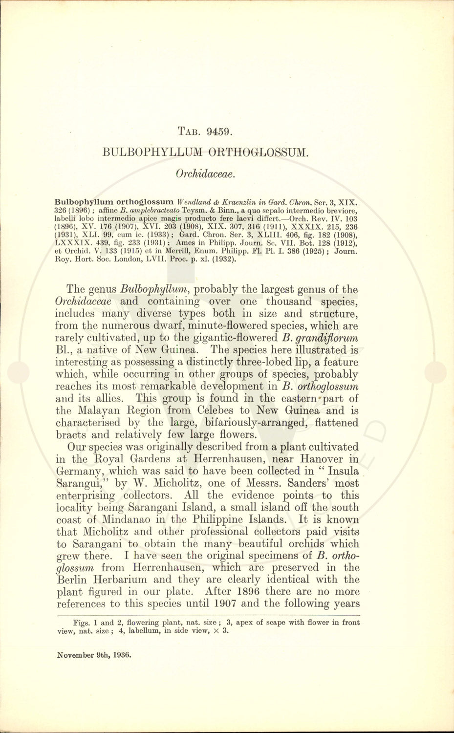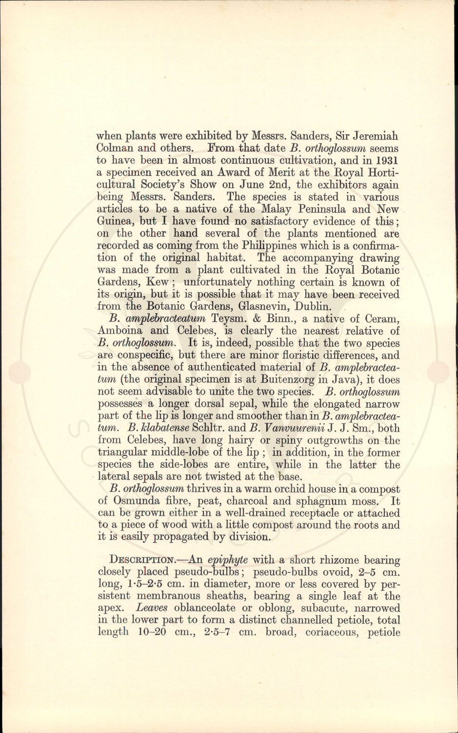 Our species was originally described from a plant cultivated in the Royal Gardens at Herrenhausen, near Hanover in Germany, which was said to have been collected in "Insula Sarangui," by W. Micholitz, one of Messrs. Sanders' most enterprising collectors. All the evidence points to this locality being Sarangani Island, a small island off the south coast of Mindanao in the Philippine Islands. It is known that Micholitz and other professional collectors paid visits to Sarangani to obtain the many beautiful orchids which grew there. I have seen the original specimens of B. ortho- glossum from Herrenhausen, which are preserved in the Berlin Herbarium and they are clearly identical with the plant figured in our plate. After 1896 there are no more references to this species until 1907 and the following years Figs. 1 and 2, flowering plant, nat. size; 3, apex of scape with flower in front view, nat. size; 4, labellum, in side view, x 3. November 9th, 1936. when plants were exhibited by Messrs. Sanders, Sir Jeremiah Colman and others. From that date B. orthoglossum seems to have been in almost continuous cultivation, and in 1931 a specimen received an Award of Merit at the Royal Horti- cultural Society's Show on June 2nd, the exhibitors again being Messrs. Sanders. The species is stated in various articles to be a native of the Malay Peninsula and New Guinea, but I have found no satisfactory evidence of this; on the other hand several of the plants mentioned are recorded as coming from the Philippines which is a confirma- tion of the original habitat. The accompanying drawing was made from a plant cultivated in the Royal Botanic Gardens, Kew; unfortunately nothing certain is known of its origin, but it is possible that it may have been received from the Botanic Gardens, Glasnevin, Dublin. B. amplebracteatum Teysm. & Binn., a native of Ceram, Amboina and Celebes, is clearly the nearest relative of B. orthoglossum. It is, indeed, possible that the two species are conspecific, but there are minor floristic differences, and in the absence of authenticated material of B. amplebractea- tum (the original specimen is at Buitenzorg in Java), it does not seem advisable to unite the two species. B. orthoglossum possesses a longer dorsal sepal, while the elongated narrow part of the lip is longer and smoother than in B. amplebractea- tum. B. klabatense Schltr. and B. Vanvuurenii J. J. Sm., both from Celebes, have long hairy or spiny outgrowths on the triangular middle-lobe of the lip; in addition, in the former species the side-lobes are entire, while in the latter the lateral sepals are not twisted at the base. B. orthoglossum thrives in a warm orchid house in a compost of Osmunda fibre, peat, charcoal and sphagnum moss. It can be grown either in a well-drained receptacle or attached to a piece of wood with a little compost around the roots and it is easily propagated by division. DESCRIPTION. An epiphyte with a short rhizome bearing closely placed pseudo-bulbs; pseudo-bulbs ovoid, 2-5 cm. long, 1.5-2.5 cm. in diameter, more or less covered by per- sistent membranous sheaths, bearing a single leaf at the apex. Leaves oblanceolate or oblong, subacute, narrowed in the lower part to form a distinct channelled petiole, total length 10-20 cm., 2.5-7 cm. broad, coriaceous, petiole 1-3 cm. long. Inflorescences arising from the base of the pseudo-bulb; erect, 20-30 cm. long, with about 3 widely- spaced tight acute sheaths on the peduncle and bearing up to 5 flowers at the apex; bracts large, more or less imbricate, ovate, acute, all conduplicate and flattened in the same plane, carinate, 1-2.5 cm. long. Flowers spreading, opening D S.R-C. B A, column, front view, anther raised to show pollinia, x 4; B, same, back view, x 4; C, same, side view, x 4%; D, pair of pollinia from the side, x 8. successively, large for the genus; pedicel and ovary 2-3 cm. long, green. Dorsal sepal more or less erect or ascending, lanceolate, acuminate, 3.5-4 cm. long, 1-1.5 cm. wide, lateral sepals projecting downwards, parallel, obliquely lanceolate, acuminate, concave and twisted inwards at the base, with a sharp keel at the base running out into a thick rib in the upper part, 4.5-5 cm. long, 0.75-1 cm. wide; all sepals yellowish-green or yellow, with numerous parallel red or brown stripes. Petals recurved, obliquely lanceolate, acuminate, 1.5-2 cm. long, 6-7 mm. wide, similar in colour to the sepals. Lip mobile, sharply recurved in the basal part, the remainder straight, distinctly 3-lobed, about 2 cm. long; side lobes more or less erect or curved forward, oblong, serrate at the apex and finely pustulate or verrucose on both sides, 2-3 mm. long; middle lobe almost smooth, consisting of a swollen cushion-like basal part with a deep channel along the centre and a pendulous narrow tongue-shaped, acute, apical part, 12-15 mm. long; side lobes pink with red spots; middle lobe a livid red shading to orange at the apex. Column short, produced at the apex into 2 subulate horns 5-7 mm. long, each with a short tooth on the inner margin towards the base, pale yellow; foot 5-7 mm. long, forming a short mentum with the lateral sepals, ochre-yellow with red spots. Anther hemispherical, orange. DISTRIBUTION. South of Mindanao. Philippine Islands, Sarangani Island, V. S. SUMMERHAYES.