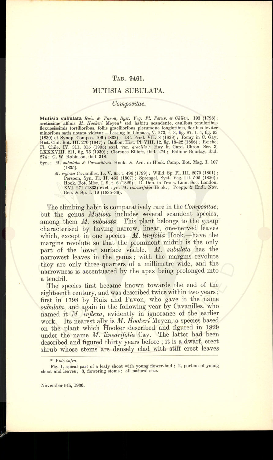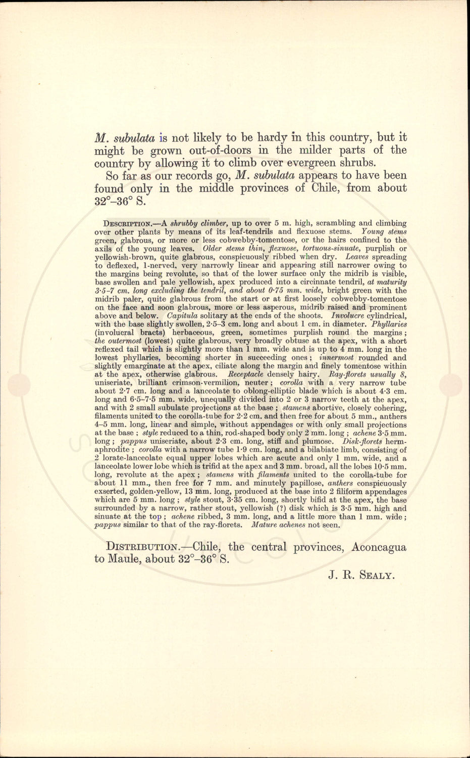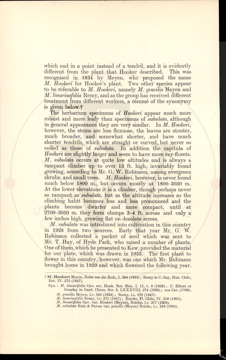 Among them M. subulata. This plant belongs to the group characterised by having narrow, linear, one-nerved leaves which, except in one species-M. linifolia Hook.-have the margins revolute so that the prominent midrib is the only part of the lower surface visible. visible. M. subulata M. subulata has the narrowest leaves in the genus; with the margins revolute they are only three-quarters of a millimetre wide, and the narrowness is accentuated by the apex being prolonged into a tendril. The species first became known towards the end of the eighteenth century, and was described twice within two years; first in 1798 by Ruiz and Pavon, who gave it the name subulata, and again in the following year by Cavanilles, who named it M. inflexa, evidently in ignorance of the earlier work. Its nearest ally is M. Hookeri Meyen, a species based on the plant which Hooker described and figured in 1829 under the name M. linearifolia Cav. The latter had been described and figured thirty years before; it is a dwarf, erect shrub whose stems are densely clad with stiff erect leaves * Vide infra.