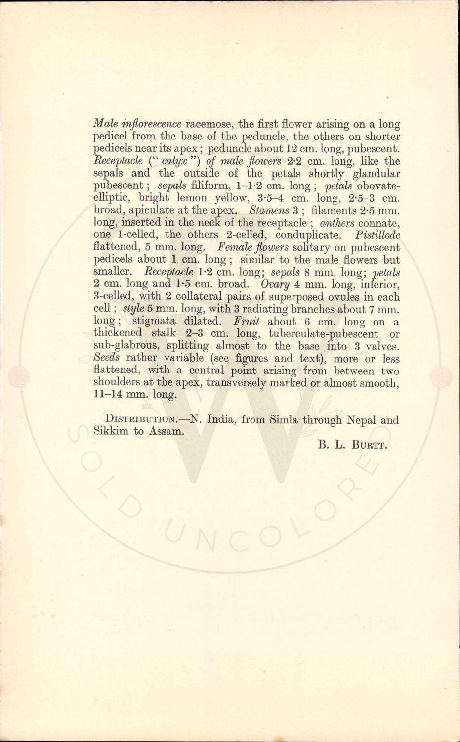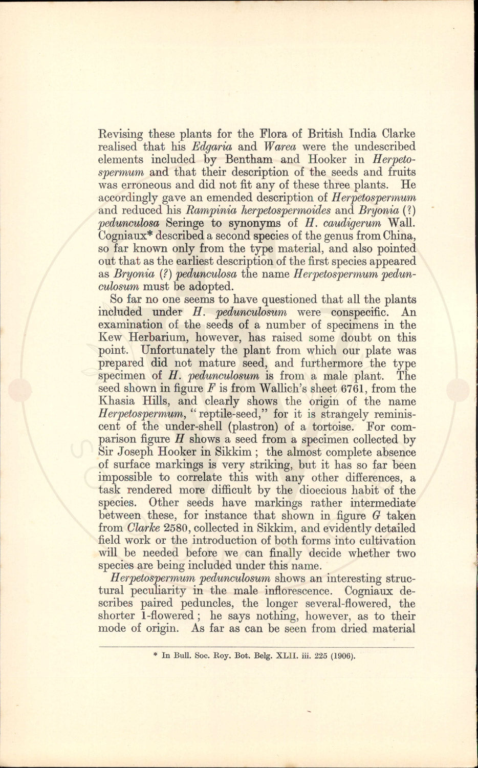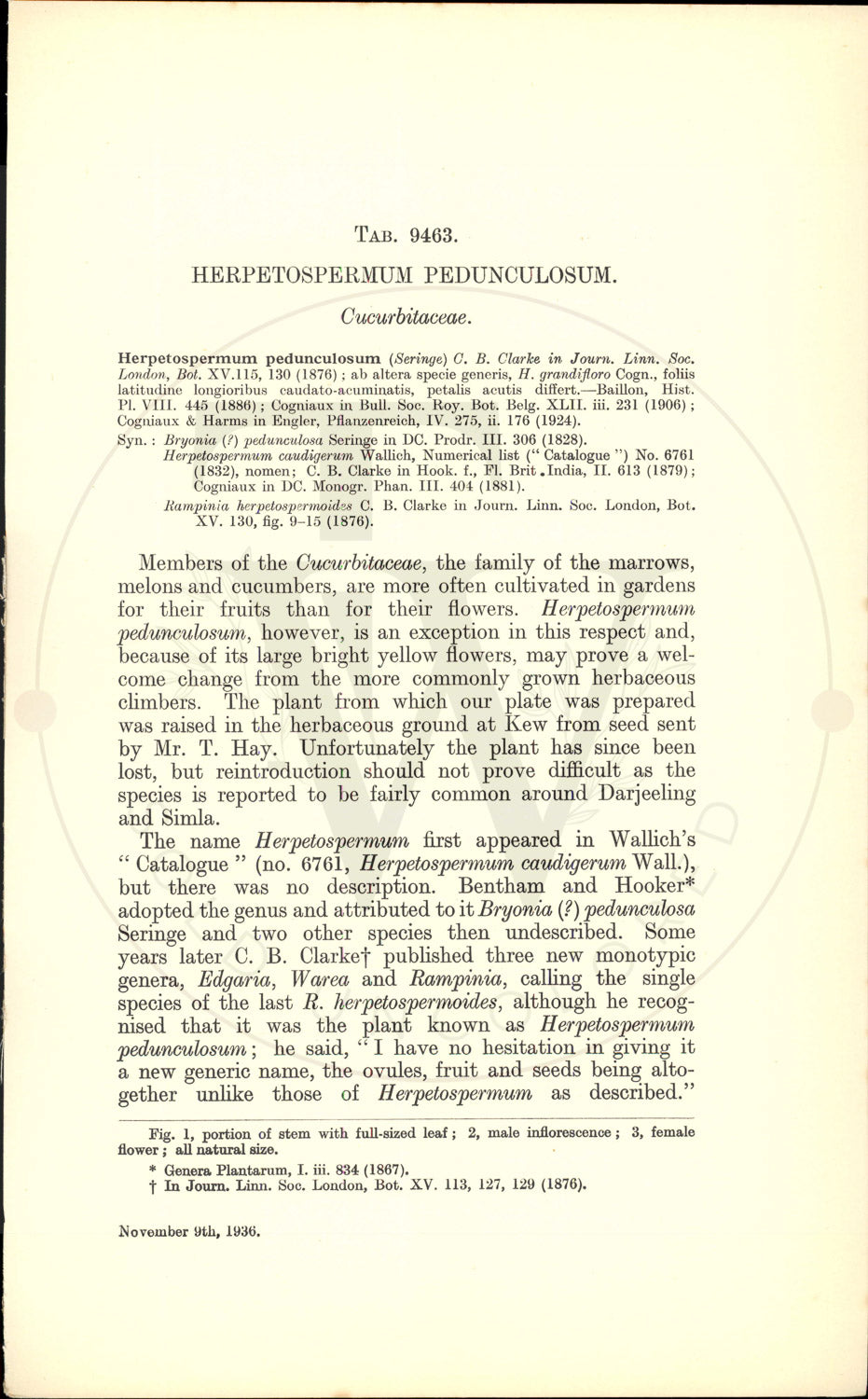 Climbers. The plant from which our plate was prepared was raised in the herbaceous ground at Kew from seed sent by Mr. T. Hay. Unfortunately the plant has since been lost, but reintroduction should not prove difficult as the species is reported to be fairly common around Darjeeling and Simla. The name Herpetospermum first appeared in Wallich's "Catalogue" (no. 6761, Herpetospermum caudigerum Wall.), but there was no description. Bentham and Hooker* adopted the genus and attributed to it Bryonia () pedunculosa Seringe and two other species then undescribed. Some years later C. B. Clarke published three new monotypic genera, Edgaria, Warea and Rampinia, calling the single species of the last R. herpetospermoides, although he recog- nised that it was the plant known as Herpetospermum pedunculosum; he said, "I have no hesitation in giving it a new generic name, the ovules, fruit and seeds being alto- gether unlike those of Herpetospermum as described.".