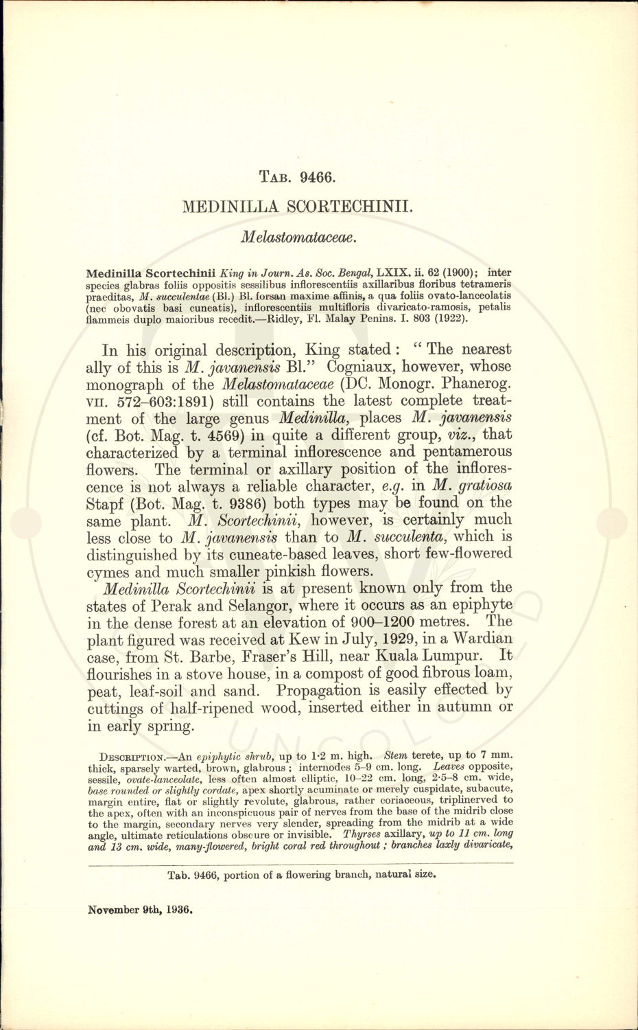 Same plant. M. Scortechinii, however, is certainly much less close to M. javanensis than to M. succulenta, which is distinguished by its cuneate-based leaves, short few-flowered cymes and much smaller pinkish flowers. Medinilla Scortechinii is at present known only from the states of Perak and Selangor, where it occurs as an epiphyte in the dense forest at an elevation of 900-1200 metres. The plant figured was received at Kew in July, 1929, in a Wardian case, from St. Barbe, Fraser's Hill, near Kuala Lumpur. It flourishes in a stove house, in a compost of good fibrous loam, peat, leaf-soil and sand. Propagation is easily effected by cuttings of half-ripened wood, inserted either in autumn or in early spring. DESCRIPTION. An epiphytic shrub, up to 1.2 m. high. Stem terete, up to 7 mm. thick, sparsely warted, brown, glabrous; internodes 5-9 cm. long. Leaves opposite, sessile, ovate-lanceolate, less often almost elliptic, 10-22 cm. long, 2-5-8 cm. wide, base rounded or slightly cordate, apex shortly acuminate or merely cuspidate, subacute, margin entire, flat or slightly revolute, glabrous, rather coriaceous, triplinerved to the apex, often with an inconspicuous pair of nerves from the base of the midrib close to the margin, secondary nerves very slender, spreading from the midrib at a wide angle, ultimate reticulations obscure or invisible. Thyrses axillary, up to 11 cm. long and 13 cm. wide, many-flowered, bright coral red throughout; branches laxly divaricate,.