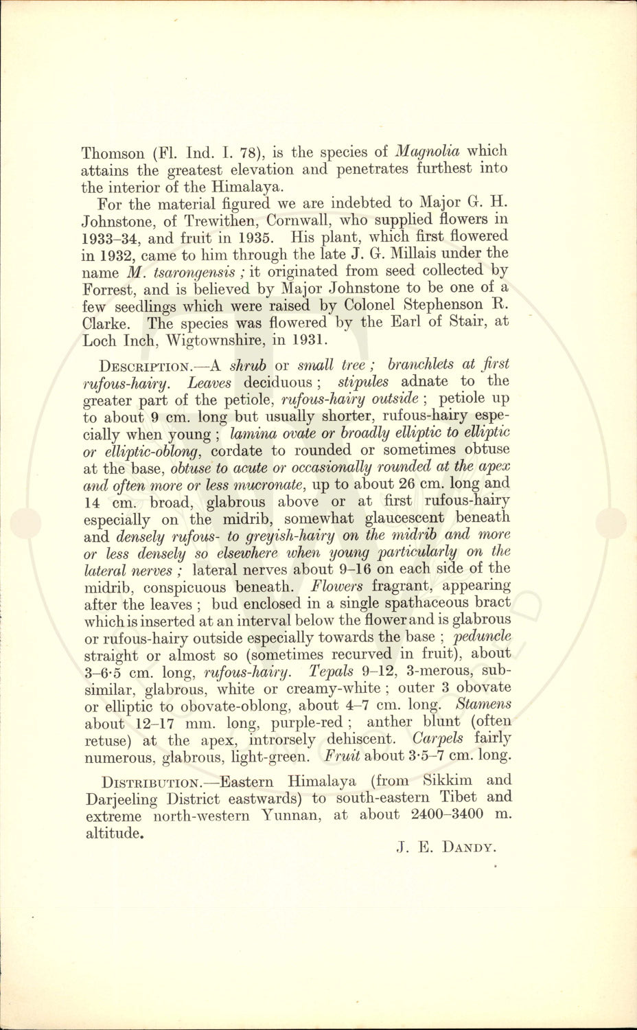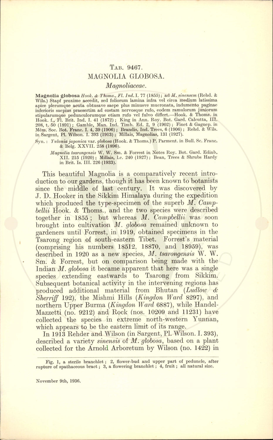This beautiful Magnolia is a comparatively recent intro- duction to our gardens, though it has been known to botanists since the middle of last century. It was discovered by J. D. Hooker in the Sikkim Himalaya during the expedition which produced the type-specimen of the superb M. Camp- bellii Hook. & Thoms., and the two species were described together in 1855; but whereas M. Campbellii was soon brought into cultivation M. globosa remained unknown to gardeners until Forrest, in 1919, obtained specimens in the Tsarong region of south-eastern Tibet. Forrest's material (comprising his numbers 18512, 18870, and 18959), was described in 1920 as a new species, M. tsarongensis W. W. Sm. & Forrest, but on comparison being made with the Indian M. globosa it became apparent that here was a single species extending eastwards to Tsarong from Sikkim. Subsequent botanical activity in the intervening regions has produced additional material from Bhutan (Ludlow & Sherriff 192), the Mishmi Hills (Kingdon Ward 8297), and northern Upper Burma (Kingdon Ward 6887), while Handel- Mazzetti (no. 9212) and Rock (nos. 10209 and 11231) have collected the species in extreme north-western Yunnan, which appears to be the eastern limit of its range. In 1913 Rehder and Wilson (in Sargent, Pl. Wilson. I. 393), described a variety sinensis of M. globosa, based on a plant collected for the Arnold Arboretum by Wilson (no. 1422) in.