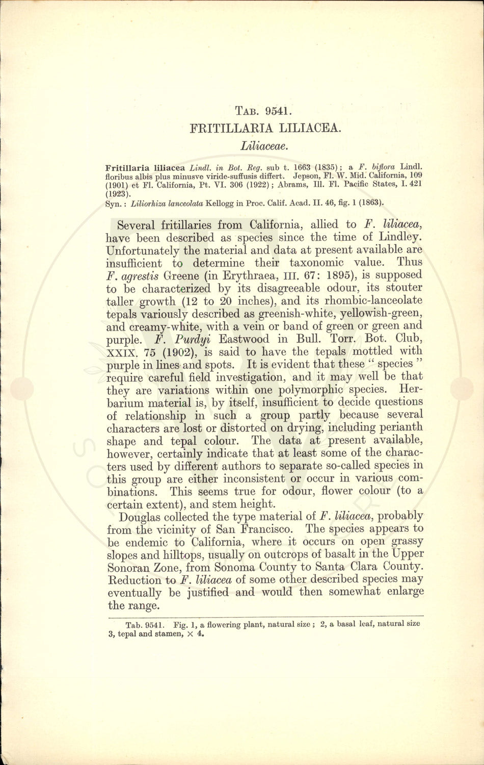 Have been described as species since the time of Lindley. Unfortunately the material and data at present available are insufficient to determine their taxonomic value. Thus F. agrestis Greene (in Erythraea, III. 67: 1895), is supposed to be characterized by its disagreeable odour, its stouter taller growth (12 to 20 inches), and its rhombic-lanceolate tepals variously described as greenish-white, yellowish-green, and creamy-white, with a vein or band of green or green and purple. F. Purdyi Eastwood in Bull. Torr. Bot. Club, XXIX. 75 (1902), is said to have the tepals mottled with purple in lines and spots. It is evident that these "species require careful field investigation, and it may well be that they are variations within one polymorphic species. Her- barium material is, by itself, insufficient to decide questions of relationship in such a group partly because several characters are lost or distorted on drying, including perianth shape and tepal colour. The data at present available, however, certainly indicate that at least some of the charac- ters used by different authors to separate so-called species in this group are either inconsistent or occur in various com- binations. This seems true for odour, flower colour (to a certain extent), and stem height. Douglas collected the type material of F. liliacea, probably from the vicinity of San Francisco. The species appears to be endemic to California, where it occurs on open grassy slopes and hilltops, usually on outcrops of basalt in the Upper Sonoran Zone, from Sonoma County to Santa Clara County. Reduction to F. liliacea of some other described species may eventually be justified and would then somewhat enlarge the range.