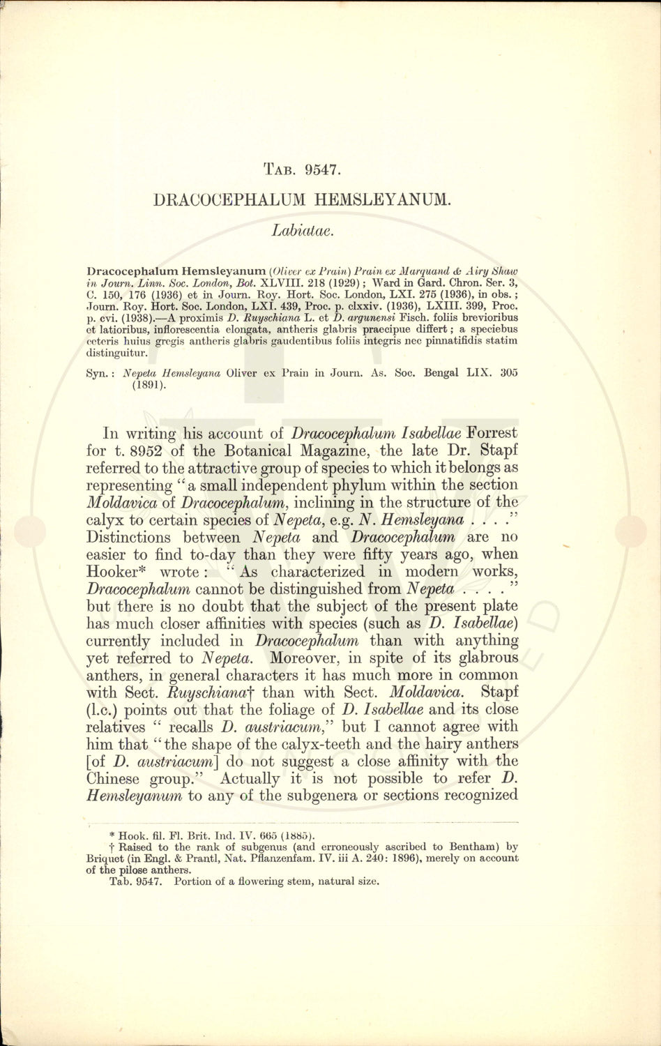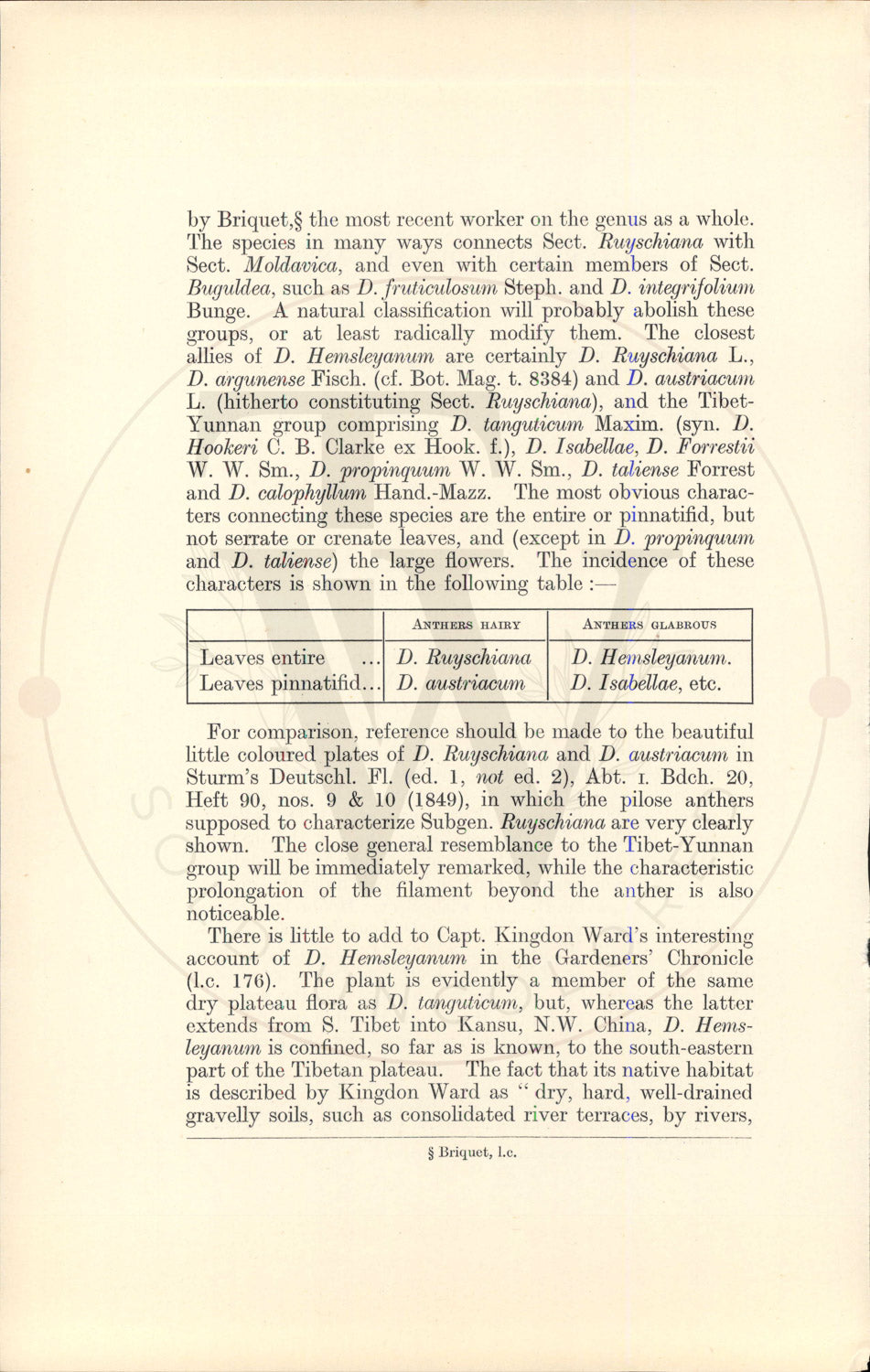 For comparison, reference should be made to the beautiful little coloured plates of D. Ruyschiana and D. austriacum in Sturm's Deutschl. Fl. (ed. 1, not ed. 2), Abt. 1. Bdch. 20, Heft 90, nos. 9 & 10 (1849), in which the pilose anthers supposed to characterize Subgen. Ruyschiana are very clearly shown. The close general resemblance to the Tibet-Yunnan group will be immediately remarked, while the characteristic prolongation of the filament beyond the anther is also noticeable. There is little to add to Capt. Kingdon Ward's interesting account of D. Hemsleyanum in the Gardeners' Chronicle (1.c. 176). The plant is evidently a member of the same dry plateau flora as D. tanguticum, but, whereas the latter extends from S. Tibet into Kansu, N.W. China, D. Hems- leyanum is confined, so far as is known, to the south-eastern part of the Tibetan plateau. The fact that its native habitat is described by Kingdon Ward as dry, hard, well-drained gravelly soils, such as consolidated river terraces, by rivers, Briquet, 1.c. 66 in full exposure" is sufficient indication of its requirements under cultivation. For the material figured we are indebted to Major F. C. Stern, of Highdown, Goring-by-Sea, Sussex, who raised his plants from seeds collected by Kingdon Ward (no. 11841) on his 1935 expedition. D. Hemsleyanum has also been B E F Gr A H K J C D S.R-C. A, portion of stem, x 6; B, calyx, x 2; C, calyx, opened out, showing the gynoecium, x 2; D, corolla with lower lip removed, opened out to show the stamens, x 2; E, lower lip of corolla, x 2; F, G, & H, apical part of a longer stamen, anther dehisced, in side, front, and back views, x 8; J & K, apical part of a shorter stamen, anther just opening, in back and front views, x 8. raised by Mr. L. de Rothschild and at Kew, from seeds collected by Sherriff (no. 2255). On June 28th, 1938, the species was exhibited at the Royal Horticultural Society's show by Mr. Rothschild and by Major Stern, and received an Award of Merit as a hardy flowering plant. DESCRIPTION. Tufted erect perennial herb, up to 0.5 m. high. Stems up to 6 mm. thick at base, deflexed-puberulous, branched, branches ascending-erect, very leafy. Leaves oblong or elliptic-oblong or lanceolate-oblong, 2-5 cm. long,.