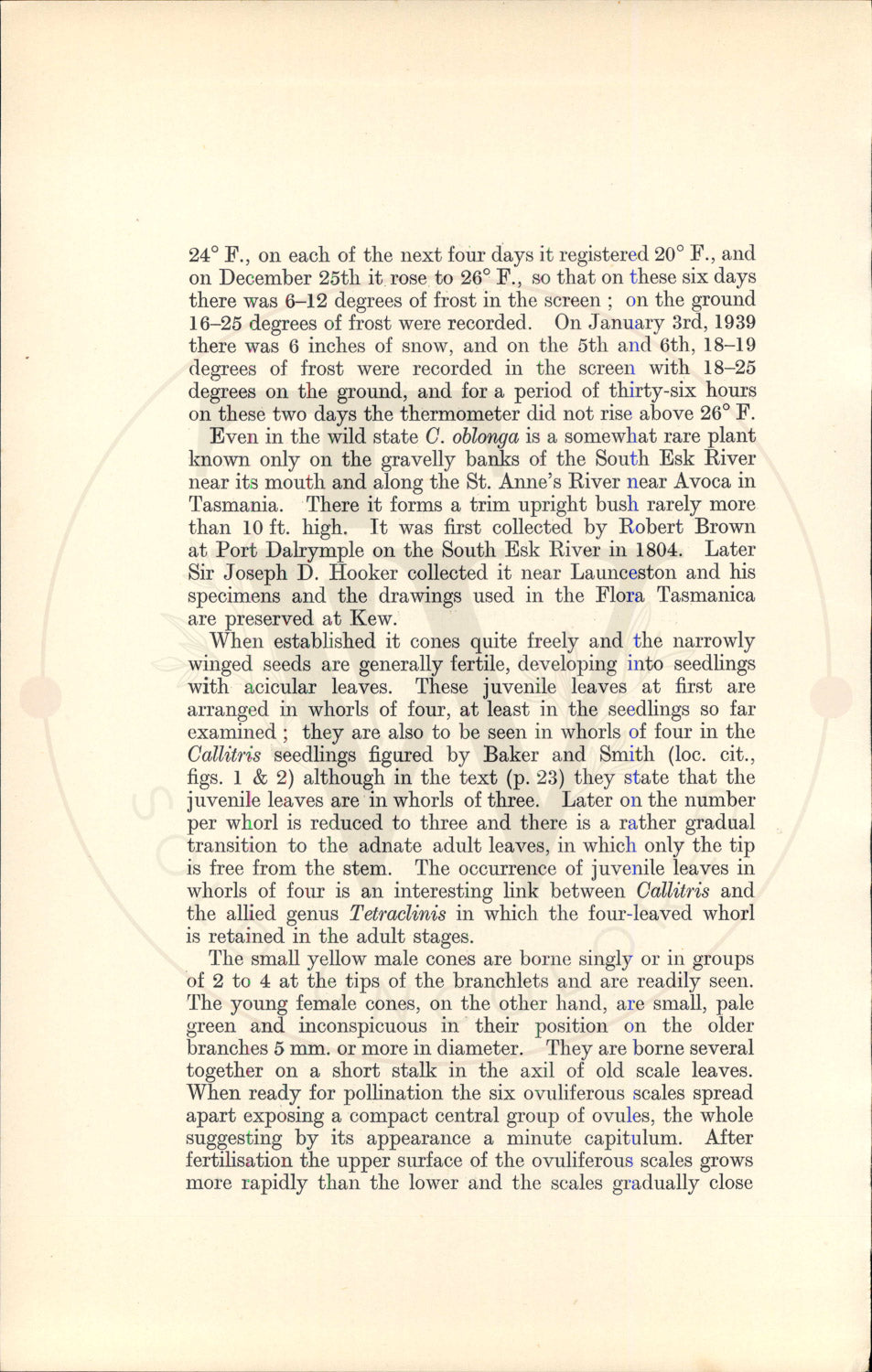 Who writes that he raised two plants from cuttings given to him in 1919 by the late Sir John Ross of Bladensburg, from the tree at Rostrevor. The taller of the two plants at Kells is now seven feet high, and so far does not seem to have suffered from the rigours of the present winter. The other plant, however, is quite brown and appears to be dead, though curiously enough it is growing in a less cold place than the first plant. Lord Headfort tells us that Callitris oblonga has never been damaged before, but conditions at Kells have been particularly severe this winter, as may be judged from the following data which Lord Headfort has supplied. On December 20th, 1938, the thermometer in the screen fell to.