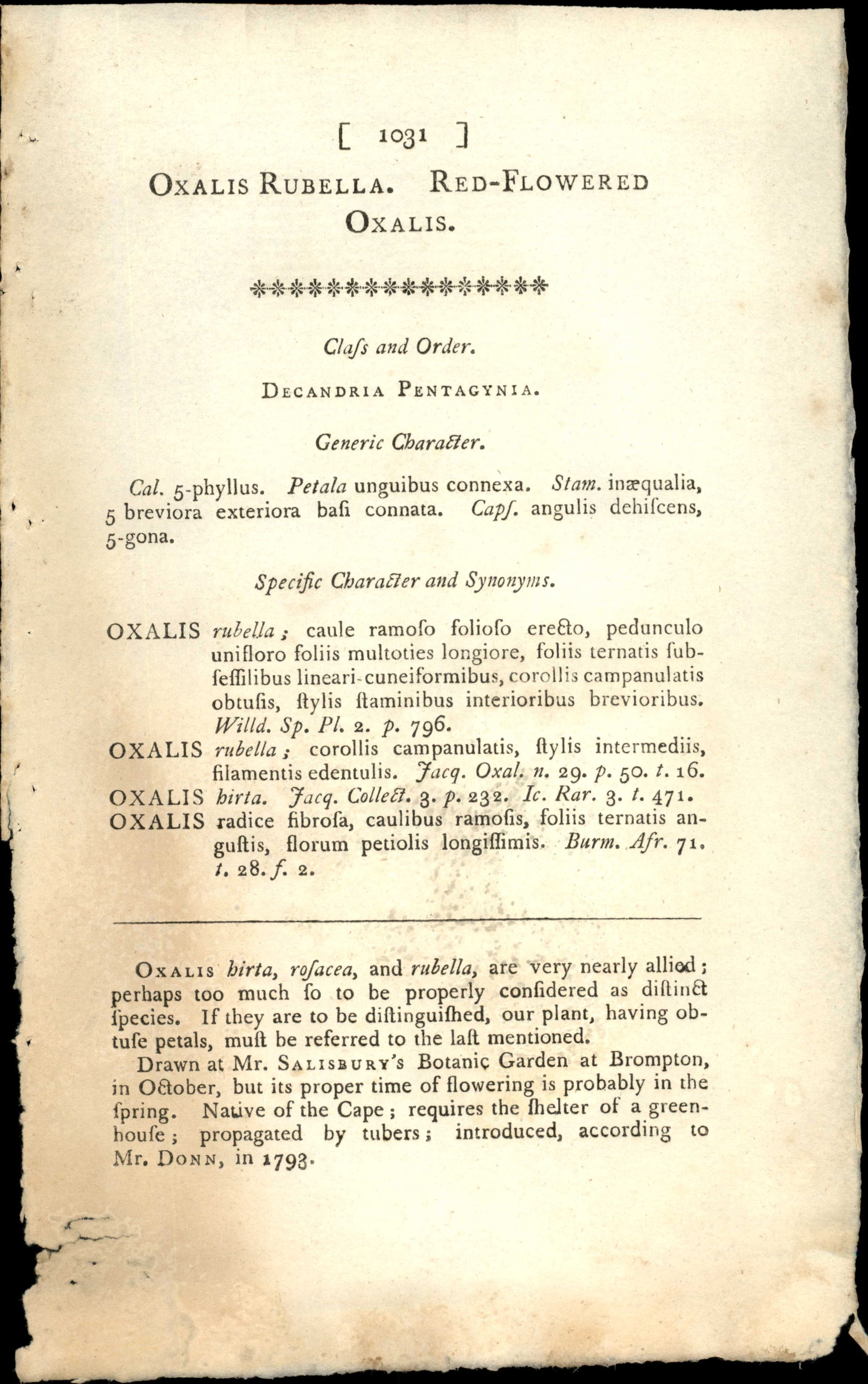 OXALIS birta, rofacea, and rubella, are very nearly allied; perhaps too much so to be properly considered as distinct species. If they are to be distinguished, our plant, having ob- tuse petals, must be referred to the last mentioned. Drawn at Mr. SALIsBURY'S Botanic Garden at Brompton, in October, but its proper time of flowering is probably in the spring. Native of the Cape; requires the shelter of a green- house; propagated by tubers; introduced, according to Mr. DONN, in 1793. Publisher:
