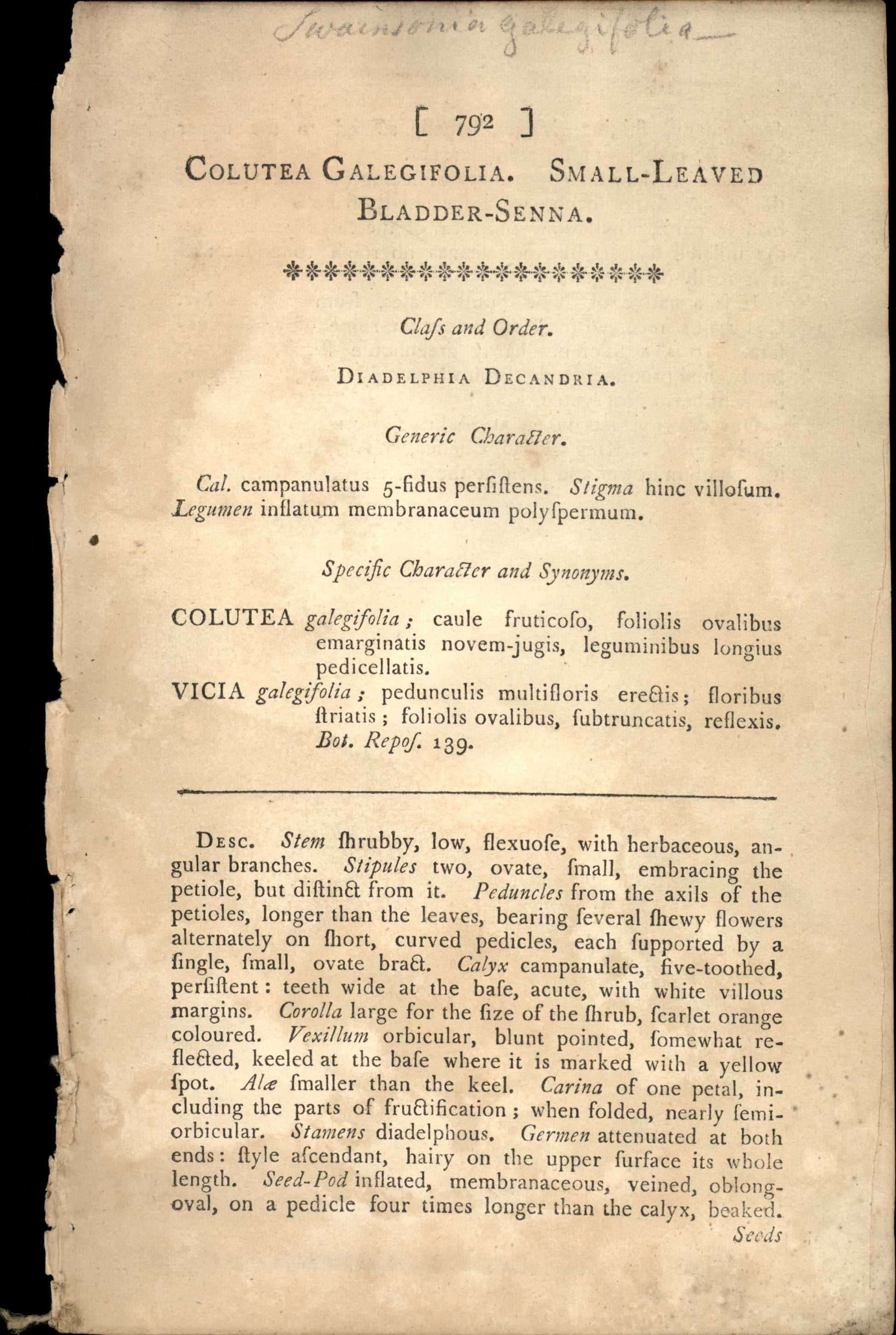 ESansom sculp swainsonia Galegisolia_ [ 792 ] COLUTEA GALEGIFOLIA. sMALL-LEAVED **** BLADDER-SENNA. ********** Class and Order. **** DIADELPHIA DECANDRIA.