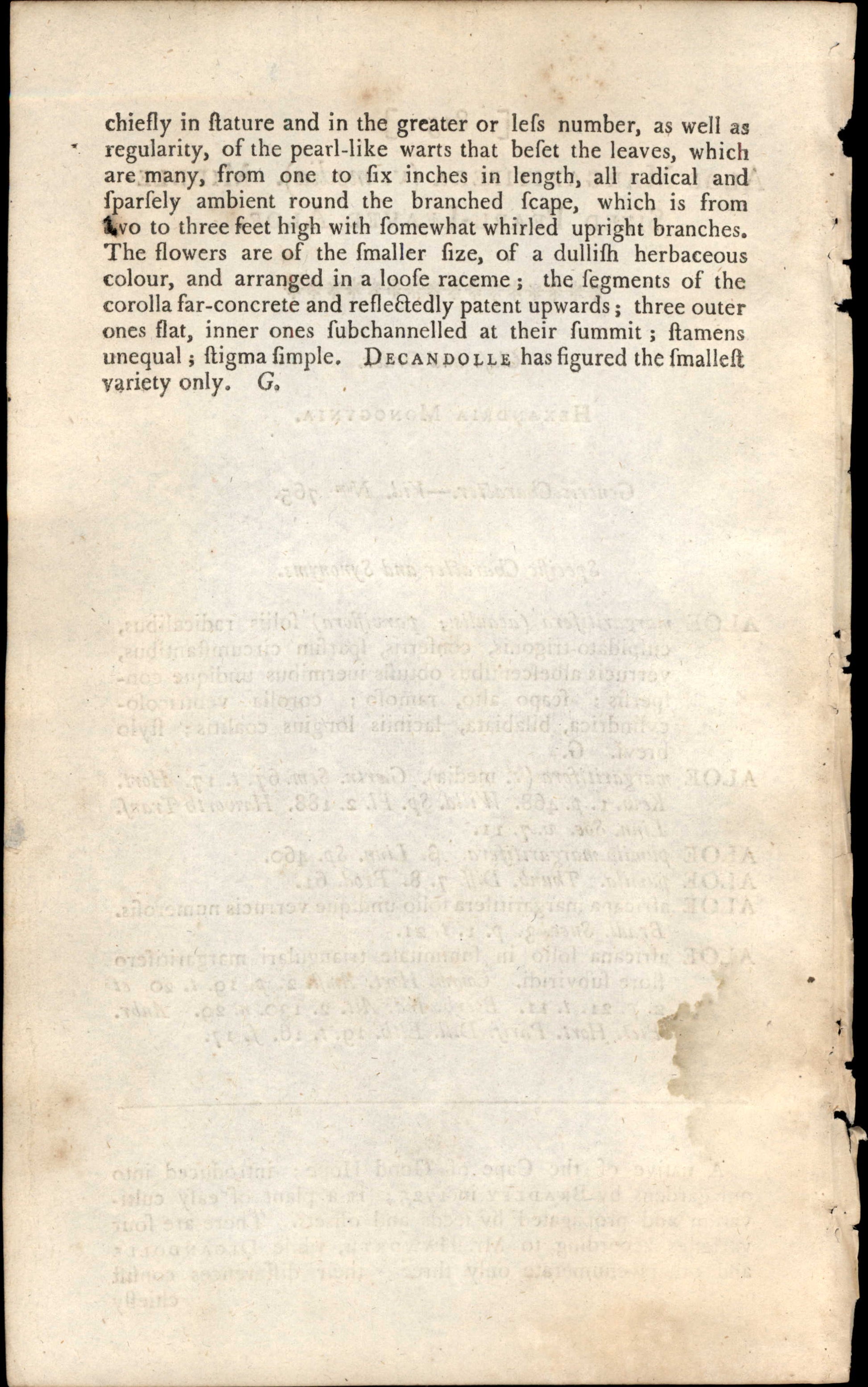 HAWORTH, while DECANDOLLE and others enumerate only three; their differences confift chiefly chiefly in ftature and in the greater or less number, as well as regularity, of the pearl-like warts that beset the leaves, which are many, from one to six inches in length, all radical and fparfely ambient round the branched fcape, which is from vo to three feet high with somewhat whirled upright branches.